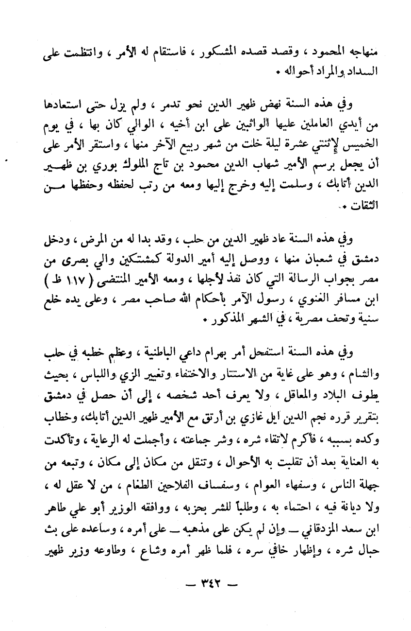 منهاجه المحمود وقصد قصده المشكور فاستقام له الأمر وانتظمت على السداد والمراد أحواله وفي هذه السنة نهض ظهير الدين نحو تدمر ولم يزل حتى استعادها من أيدي العاملين عليها المواثبين على ابن أخيه الوالي كان بها في يوم الخميس لإثنتي عشرة ليلة خلت من شهر ربيع الآخر منها واستقر الأمر على أن يجعل برسم الأمير شهاب الدين محمود بن تاج الملوك بوري بن ظهير الدين أتابك وسلمت إليه وخرج إليها ومعه من رتب لحفظه وحفظها من الثقات وفي هذه السنة عاد ظهير الدين من حلب وقد بدا له من المرض ودخل دمشق في شعبان منها ووصل إليه أمين الدولة كمشتكين والي بصرى من مصر بجواب الرسالة التي كان نفذ لأجلها ومعه الأمير المنتضى ابن مسافر الغنوي رسول الآمر بأحكام الله صاحب مصر وعلى يده خلع سنية وتحف مصرية في الشهر المذكور وفي هذه السنة استفحل أمر بهرام داعي الباطنية وعظم خطبه في حلب والشام وهو على غاية من الاستتار والاختفاء وتغيير الزي واللباس بحيث يطوف البلاد والمعاقل ولا يعرف أحد شخصه إلى أن حصل في دمشق بتقرير قرره نجم الدين ايل غازي بن ارتق مع الأمير ظهير الدين أتابك وخطاب وكده بسببه فأكرم لاتقاء شره وشر جماعته وحملت له الرعاية وتأكدت به العناية بعد أن تقلبت به الأحوال وتنقل من مكان إلى مكان وتبعه من جهلة الناس وسفهاء العوام وسفساف الفلاحين الطغام من لا عقل له ولا ديانة فيه احتماءً به وطلباً للشر بحزبه. ووافقه الوزير أبو علي طاهر بن سعد المزدقاني وإن لم يكن على مذهبه على أمره وساعده على بث حبال شره وإظهار خافي سره. فلما ظهر أمره وشاع وطاوعه وزير ظهير