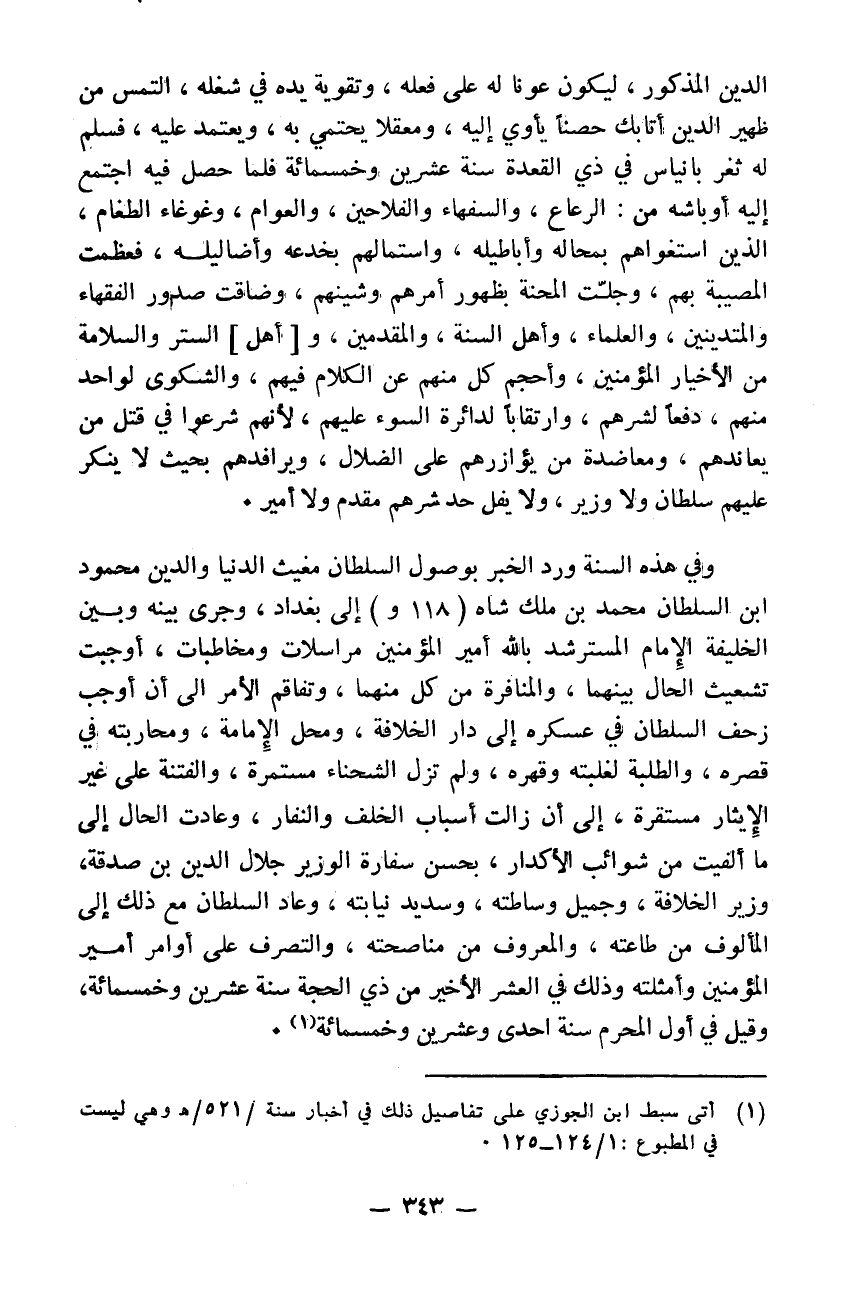 وفي هذه السنة ورد الخبر بوصول السلطان مغيث الدنيا والدين محمود ابن السلطان محمد بن ملك شاه إلى بغداد وجرى بينه وبين الخليفة الامام المسترشد بالله أمير المؤمنين مراسلات ومخاطبات أوجبت تشعيث الحال بينهما والمنافرة من كل منهما وتفاقم الأمر إلى أن أوجب زحف السلطان في عسكره إلى دار الخلافة ومحل الامامة ومحاربته في قصره والطلبة لغلبته وقهره ولم يزل الشحناء مستمرة والفتنة على غير الايثار مستقرة إلى أن زالت أسباب الخلف والنفار وعادت الحال إلى ما ألفيت من شوائب الأكدار بحسن سفارة الوزير جلال الدين بن صدقة وزير الخلافة وجميل وساطته وسديد نيابته وعاد السلطان مع ذلك إلى المألوف من طاعته والمعروف من مناصحته والتصرف على أوامر أمير المؤمنين وأمثلته وذلك في العشر الأخير من ذي الحجة سنة 520 وقيل في أول المحرم سنة 521