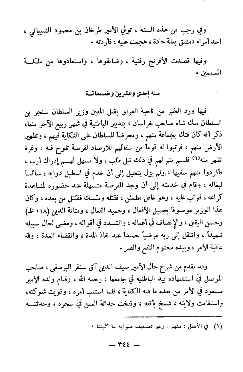 فيها ورد الخبر من ناحية العراق بقتل المعين وزير السلطان سنجر ابن السلطان ملك شاه صاحب خراسان بتدبير الباطنية في شهر ربيع الآخر منها. ذكر إنه كان فتك بجماعة منهم ومحرضاً للسلطان على النكاية فيهم وتطهير الأرض منهم فرتبوا له قوماً من سفهائهم للأرصاد لفرصة تلوح فيه وغرة تظهر منهم فلم يتم لهم في ذلك نيل طلب ولا تسهل لهم إدراك أرب فافردوا منهم سفيهاً ولم يزل يتحيل إلى أن خدم في اسطبل دوابه سائساً لبغاله وأقام في خدمته إلى أن وجد الفرصة متسهلة عند حضوره لمشاهدة كراعه فوثب عليه وهو غافل مطمئن فقتله ومسك فقتل من بعده. وكان هذا الوزير موصوفاً بجميل الأفعال وحميد الفعال ومتانة الدين وحسن اليقين والانصاف في أعماله والتسدد في أقواله ومضى لحال سبيله شهيداً وانتقل إلى ربه مرضياً حميداً عند نفاد المدة وانقضاء العدة ولله عاقبة الأمر وبيده محتوم النفع والضر وقد تقدم من شرح حال الأمير سيف الدين اق سنقر البرسقي صاحب الموصل في استشهاده بيد الباطنية في جامعها رحمه الله وقيام ولده الأمير مسعود في الأمر من بعده ما فيه الكفاية. فلما استتب أمره وقويت شوكته واستقامت ولايته شمخ بأنفه ونفخت حداثة السن في سحره وحدثته