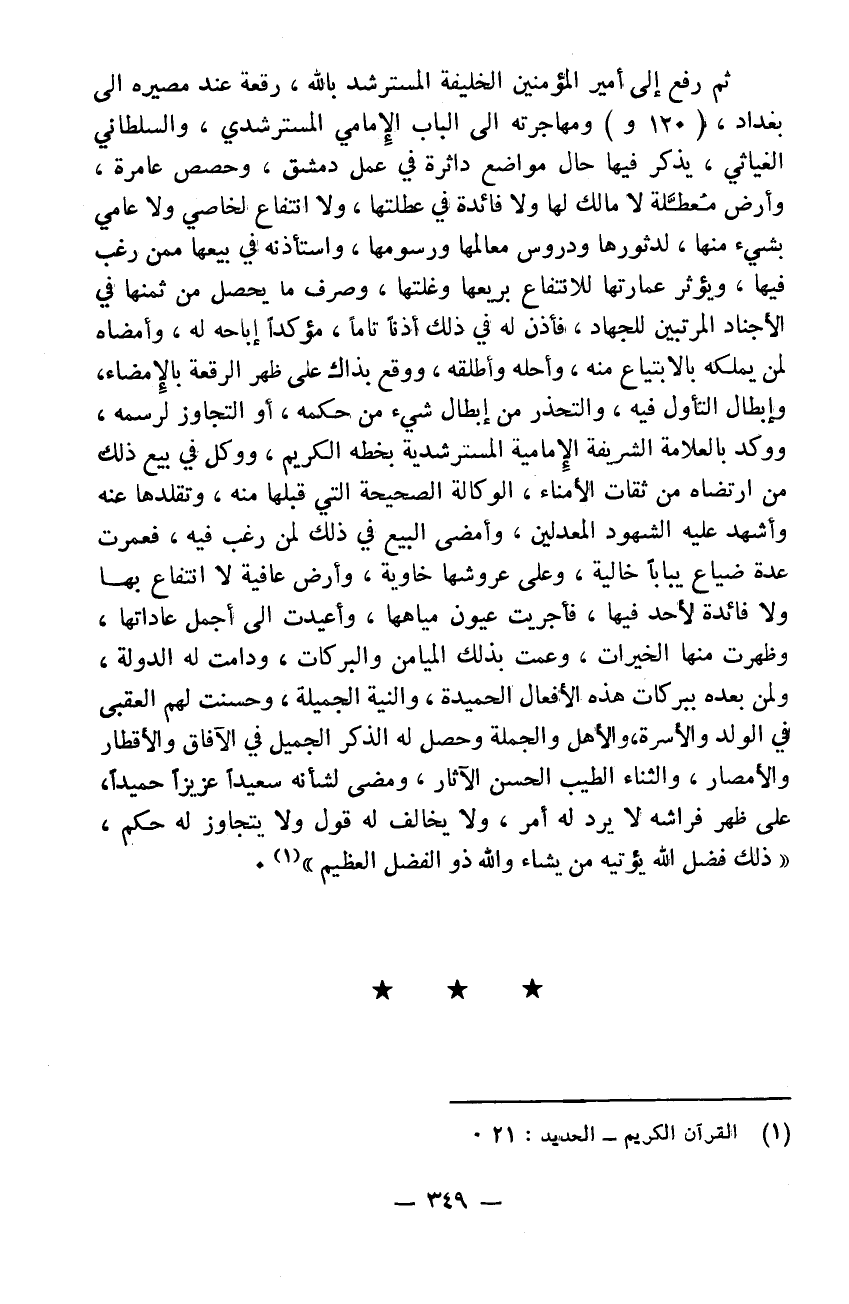 ثم رفع إلى أمير المؤمنين الخليفة المسترشد بالله رقعةً عند مصيره إلى بغداد ومهاجرته إلى الباب الأماملي المسترشدي والسلطاني الغياثي يذكر فيها حال مواضع دائرة في عمل دمشق وحصص عامرة وأرض معطلة لا مالك لها ولا فائدة في عطلتها ولا انتفاع لخاصي ولا عامي بشيء منها لدثورها ودروس معاملها ورسومها واستأذنه في بيعها ممن رغب فيها ويؤثر عمارتها للانتفاع بريعها وغلتها وصرف ما يحصل من ثمنها في الأجناد المرتبين للجهاد فأذن له في ذلك أذناً تاماً مؤكداً أباحه له وأمضاه لمن يملكه بالابتياع منه وأحله وأطلقه ووقع بذاك على ظهر الرقعة بالأمضاء وإبطال التأول فيه والتحذر من إبطال شيء من حكمه أو التجاوز لرسمه ووكد بالعلامة الشريفة الأمامية المسترشدية التي قبلها منه وتقلدها عنه وأشهد عليه بذلك الشهود المعدلين وأمضى البيع في ذلك لمن رغب فيه فعمرت عدة ضياع يباباً خالية وعلى عروشها خاوية وأرض عافية لا انتفاع بها ولا فائدة لأحد فيها فأجريت عيون مياهها وأعيدت إلى أجمل عاداتها وظهرت منها الخيرات وعمت بذلك الميامن والبركات ودامت له الدولة ولمن بعده ببركات هذه الأفعال الحميدة والنية الجميلة وحسنت لهم العقبى في الولد والأسرة والأهل والجملة وحصل له الذكر الجميل في الآفاق والأقطار والأمصار والثناء الطيب الحسن الآثار ومضى لشأنه سعيداً عزيزاً حميداً على ظهر فراشه لا يرد له أمر ولا يخالف له قول ولا يتجاوز له حكم ذلك فضل الله يؤتيه من يشاء والله ذو الفضل العظيم