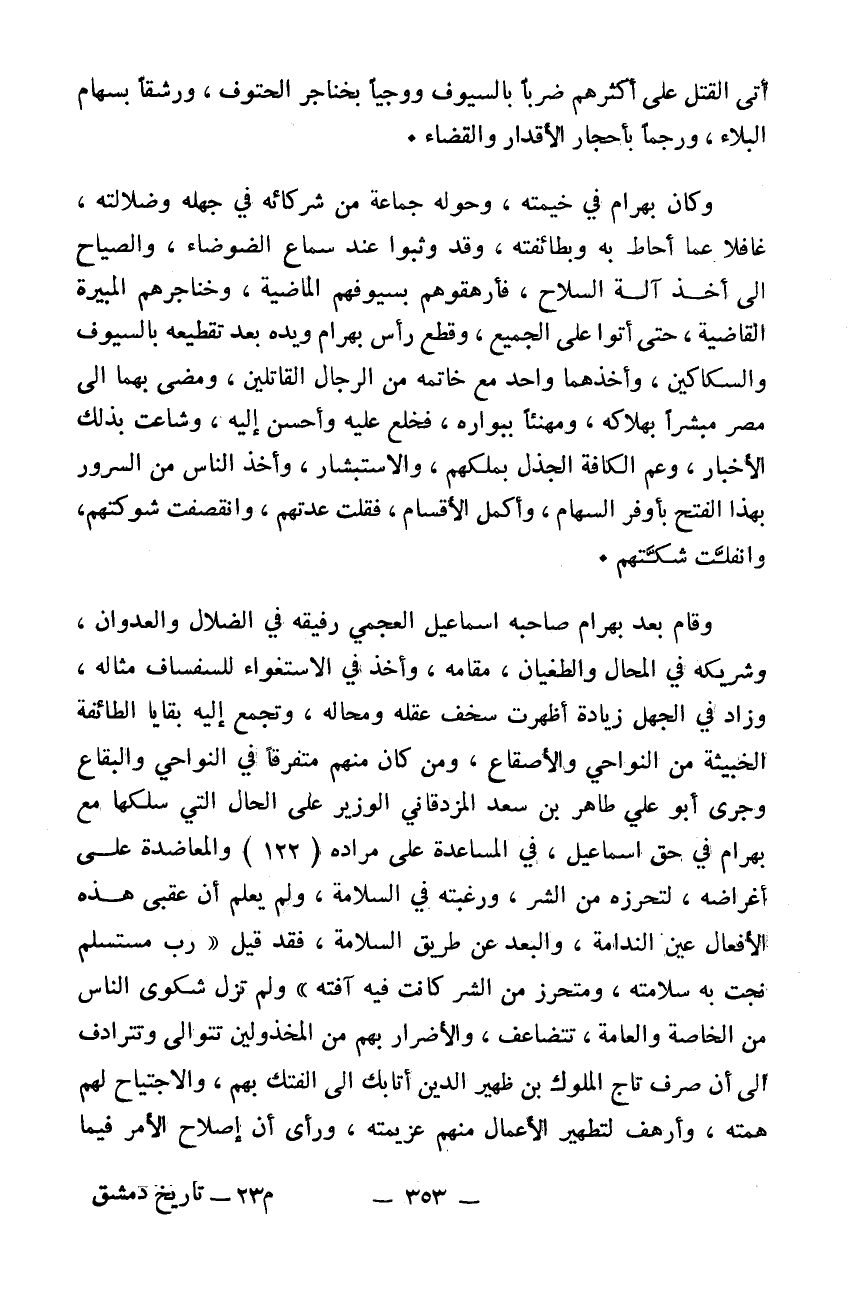 أتى القتل على أكثرهم ضرباً بالسيوف ووجياً بخناجر الحتوف ورشقاً بسهام البلاء ورجماً بأحجار الأقدار والقضاء وكان بهرام في خيمته وحوله جماعة من شركائه في جهله وضلالته غافلاً عما أحاط به وبطائفته وقد وثبوا عند سماع الضوضاء والصياح إلى أخذ آلة السلاح فأرهقوهم بسيوفهم الماضية وخناجرهم المبيرة القاضية حتى أتوا على الجميع وقطع رأس بهرام ويده بعد تقطيعه بالسيوف والسكاكين وأخذهما واحد مع خاتمه من الرجال القاتلين ومضى بهما إلى مصر مبشراً بهلاكه ومهنئاً ببواره فخلع عليه وأحسن إليه وشاعت بذلك الأخبار وعم الكافة الجذل بمهلكهم والاستبشار وأخذ الناس من السرور بهذا الفتح بأوفر السهام وأكمل الأقسام فقلت عدتهم وانقصفت شوكتهم وانفلت شكتهم