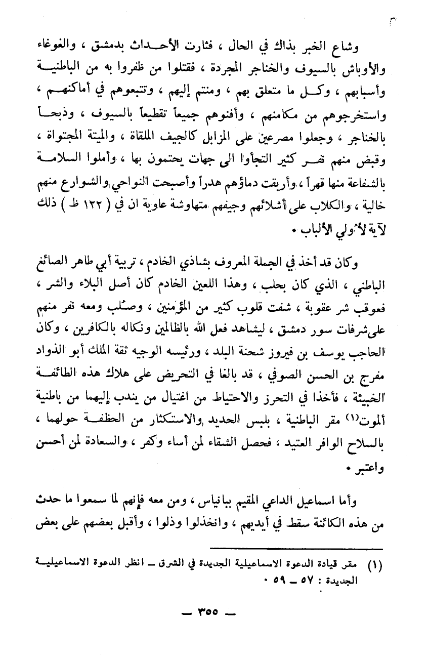 وشاع الخبر بذاك في الحال فثارت الأحداث بدمشق والغوغاء والأوباش بالسيوف والخناجر المجردة فقتلوا من ظفروا به من الباطنية وأسبابهم وكل متعلق بهم ومنتم إليهم وتتبعوهم في أماكنهم واستخرجوهم من مكانهم وأفنوهم جميعاً تقطيعاً بالسيوف وذبحاً بالخناجر وجعلوا مصرعين على المزابل كالجيف الملقاة والميتة المجتواة وقبض منهم نفر كثير التجأوا إلى جهات يحتمون بها وأملوا السلامة بالشفاعة منها قهراً وأريقت دماؤهم هدراً وأصبحت النواحي والشوارع منهم خالية والكلاب على أشلائهم وجيفهم متهارشة عاوية إن في ذلك لآية لأولي الألباب وكان قد أخذ في الجملة المعروف بشاذي الخادم تربية أبي طاهر الصائغ الباطني الذي كان بحلب وهذا اللعين الخادم كان أصل البلاء والشر فعوقب شر عقوبة شفت قلوب كثير من المؤمنين وصلب ومعه نفر منهم على شرفات سور دمشق ليشاهد فعل الله بالظالمين ونكاله بالكافرين. وكان الحاجب يوسف بن فيروز شحنة البلد ورئيسه الوجيه ثقة الملك أبو الذواد مفرج بن الحسن الصوفي قد بالغا في التحريض على هلاك هذه الطائفة الخبيثة فأخذوا في التحرز والاحتياط من اغتيال من يندب إليهما من باطنية ألموت مقر الباطنية بلبس الحديد والاستكثار من الحفظة حولهما بالسلاح الوافر العتيد فحصل الشقاء لمن أساء وكفر والسعادة لمن أحسن واعتبر وأما إسمعيل الداعي المقيم ببانياس ومن معه فإنهم لما سمعوا ما حدث من هذه الكائنة سقط في أيديهم وانخذلوا وذلوا وأقبل بعضهم على بعض