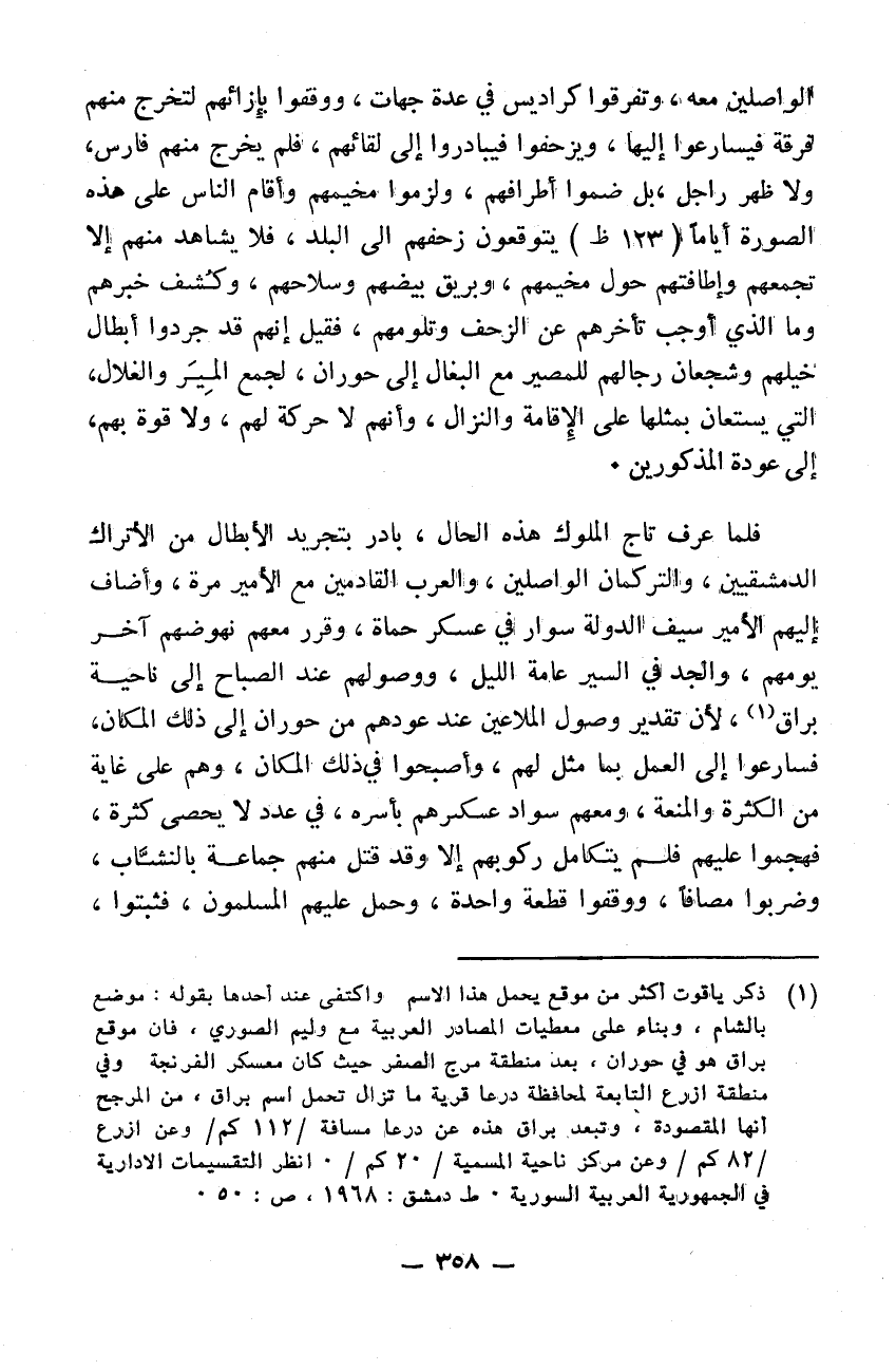 فلما عرف تاج الملوك هذه الحال بادر بتجريد الأبطال من الأتراك الدمشقيين والتركمان الواصلين والعرب القادمين مع الأمير مرة وأضاف إليهم الأمير سيف الدولة سوار في عسكر حماة وقرر معهم نهوضهم آخر يومهم والجد في السير عامة الليل ووصولهم عند الصباح إلى ناحية براق لأن تقدير وصول الملاعين عند عودهم من حوران إلى ذلك المكان. فسارعوا إلى العمل بما مثل لهم وأصبحوا في ذلك المكان وهم على غاية من الكثرة والمنعة ومعهم سواد عسكرهم بأسره في عدد لا يحصى كثرةً فهجموا عليهم فلم يتكامل ركوبهم إلا وقد قتل منهم جماعة بالنشاب وضربوا مصافاً ووقفوا قطعةً واحدةً وحمل عليهم المسلمون فثبتوا