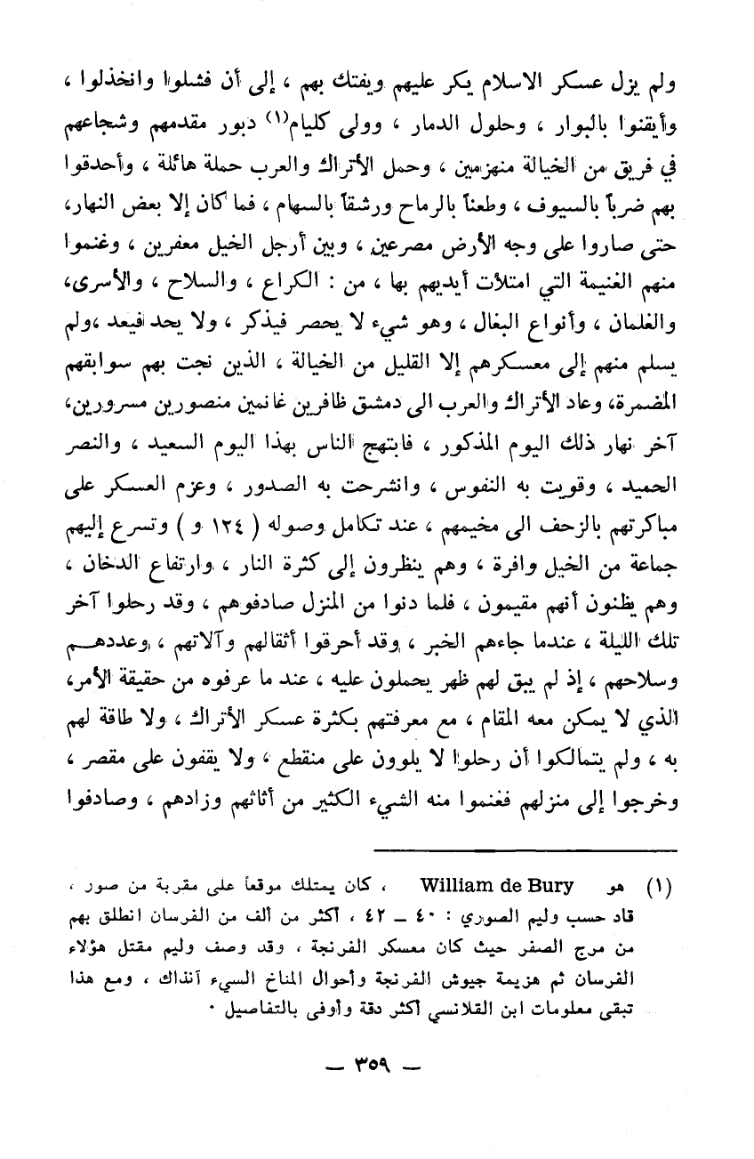 ولم يزل عسكر الاسلام يكر عليهم ويفتك بهم إلى أن فشلوا وانخذلوا وأيقنوا بالبوار وحلول الدمار. وولى كليام دبور مقدمهم وشجاعهم في فريق من الخيالة منهزمين وحمل الأتراك والعرب حملةً هائلةً وأحدقوا بهم ضرباً بالسيوف وطعناً بالرماح ورشقاً بالسهام فما كان إلا بعض النهار حتى صاروا على وجه الأرض مصرعين وبين أرجل الخيل معفرين وغنموا منهم الغنيمة التي امتلأت أيديهم بها من الكراع والسلاح والأسرى والغلمان وأنواع البغال وهو شيء لا يحصر فيذكر ولا يجد فيعد ولم يسلم منهم إلى معسكرهم إلا القليل من الخيالة الذين نجت بهم سوابقهم المضمرة وعاد الأتراك والعرب إلى دمشق ظافرين غانمين منصورين مسرورين آخر نهار ذلك اليوم المذكور. فابتهج الناس بهذا اليوم السعيد والنصر الحميد وقويت به النفوس وانشرحت به الصدور وعزم العسكر على مباكرتهم بالزحف إلى مخيمهم عند تكامل وصوله وتسرع إليهم جماعة من الخيل وافرة وهم ينظرون إلى كثرة النار وارتفاع الدخان وهم يظنون إنهم مقيمون فلما دنوا من المنزل صادفوهم وقد رحلوا آخر تلك الليلة عندما جاءهم الخبر وقد أحرقوا أثقالهم وآلاتهم وعددهم وسلاحهم إذ لم يبق لهم ظهر يحملون عليه عند ما عرفوه من حقيقة الأمر الذي لا يمكن معه المقام مع معرفتهم بكثرة عسكر الأتراك ولا طاقة لهم به ولم يتمالكوا إن رحلوا لا يلوون على منقطع ولا يقفون على مقصر وخرج إلى منزلهم فغنموا منه الشيء الكثير من أثاثهم وزادهم وصادفوا