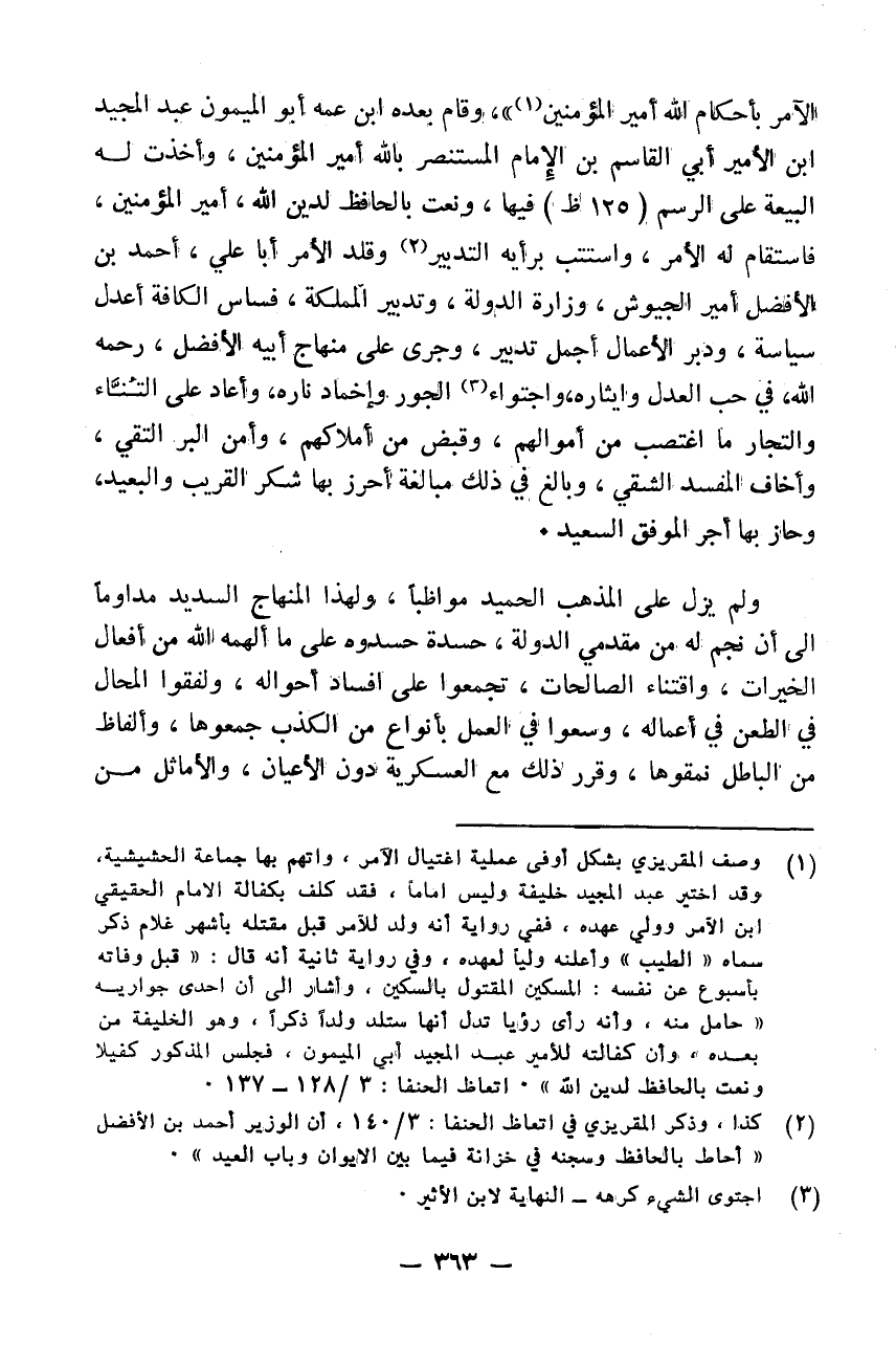 الآمر بأحكام الله أمير المؤمنين وقام بعده ابن عمه أبو الميمون عبد المجيد بن الأمير أبي القاسم ابن الامام المستنصر بالله أمير المؤمنين وأخذت له البيعة على الرسم فيها ونعت بالحافظ لدين الله أمير المؤمنين فاستقام له الأمر واستتب برأيه التدبير وقلد الأمر أبا علي أحمد بن الأفضل أمير الجيوش وزارة الدولة وتدبير المملكة فساس الكافة أعدل سياسة ودبر الأعمال أجمل تدبير وجرى على منهاج أبيه الأفضل رحمه الله في حب العدل وايثاره واحتواء الجور واخماد ناره وأعاد على التناء والتجار ما اغتصب من أموالهم وقبض من أملاكهم وأمن البر التقي وأخاف المفسد ولم يزل على هذا المذهب الحميد مواظباً ولهذا المنهاج السديد مداوماً إلى أن نجم له من مقدمي الدولة حسدة حسدوه على ما الهمة الله من أفعال الخيرات واقتناء الصالحات تجمعوا على افساد أحواله ولفقوا المحال في الطعن في أعماله وسعوا في العمل بأنواع من الكذب جمعوها وألفاظ من الباطل نمقوها وقرر ذلك مع العسكرية دون الأعيان والأماثل