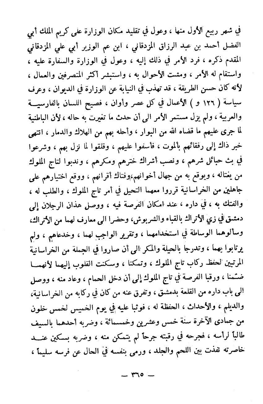 في شهر ربيع الأول منها وعول في تقليد مكان الوزارة على كريم الملك أبي الفضل أحمد بن عبد الرزاق المزدقاني ابن عم الوزير أبي علي المزدقاني المقدم ذكره فرد الأمر في ذلك إليه وعول في الوزارة والسفارة عليه واستقام له الأمر ومشت الأحوال به. واستبشر أكثر المتصرفين والعمال لأنه كان حسن الطريقة قد تهذب في النيابة عن الوزارة في الديوان وعرف سياسة الأعمال في كل عصر وأوان فصيح اللسان بالفارسية والعربية ولم يزل مستمر الأمر إلى أن حدث ما تغيرت به حاله لأن الباطنية لما جرى عليهم قضاه الله من البوار وأحله بهم من الهلاك والدمار انتهى خبر ذاك إلى رفقائهم بألموت فأسفوا عليهم وقلقوا لما نزل بهم وشرعوا في بث حبائل شرهم ونصب اشراك خترهم ومكرهم وندبوا لتاج الملوك من يغتاله ويوقع به من جهال إخوانهم وفتاك أقرانهم. ووقع اختيارهم على جاهلين من الخراسانية قرروا معهما التحيل في أمر تاج الملوك والطلب له والفتك به في داره عند إمكان الفرصة فيه ووصل هذان الرجلان إلى دمشق في زي الأتراك بالقباء والشربوش وحضرا إلى معارف لهما من الأتراك وسألوهما الوساطة في استخدامهما وتقرير الواجب لهما وخدعاهم ولم يرتابوا بهما وتدرجا بالحيلة والمكر إلى أن صارا في الجملة من الخراسانية المرتبين لحفظ ركاب تاج الملوك وتمكنا وسكنت القلوب إليهما لأنها ضمنا. ورقبا الفرصة في تاج الملوك إلى أن دخل الحمام وعاد منه ووصل إلى باب داره من القلعة بدمشق وتفرق عنه من كان في ركابه من الخراسانية والديلم والأحداث الحفظة له فوثبا عليه في يوم الخميس لخمس خلون من جمادى الآخرة سنة 525 وضربه أحدهما بالسيف طالباً لرأسه فجرحه في رقبته جرحاً لم يتمكن منه وضربه بسكين عند خاصرته نفذت بين اللحم والجلد ورمى بنفسه في الحال عن فرسه سليماً