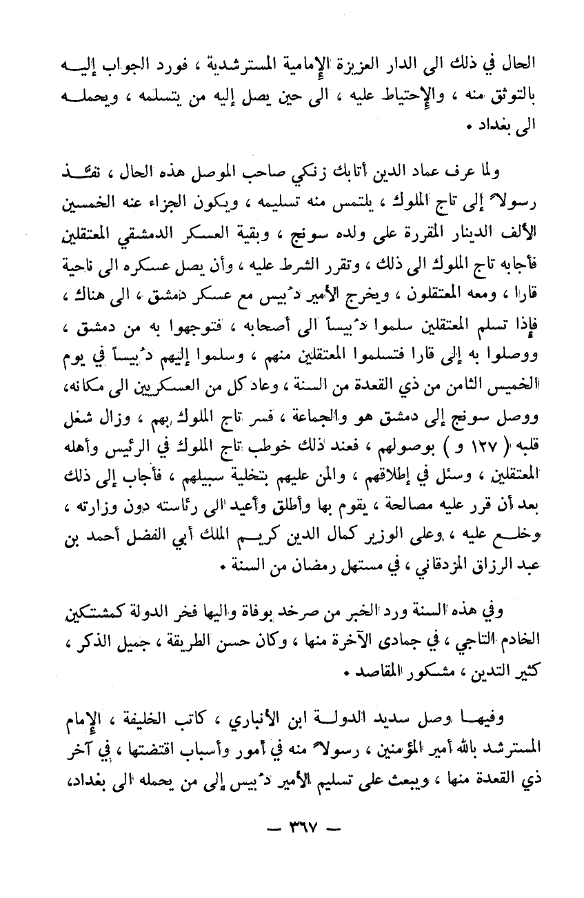 ولما عرف عماد الدين أتابك زنجي صاحب الموصل هذه الحال نفذ رسولاً له إلى تاج الملوك يلتمس منه تسليمه ويكون الجزاء عنه الخمسين الألف الدينار المقررة على ولده سونج وبقية العسكر الدمشقي المتعلقين فأجابه تاج الملوك إلى ذلك وتقرر الشرط عليه وأن يصل عسكره إلى ناحية قارا ومعه المعتقلون ويخرج الأمير دبيس مع عسكر دمشق إلى هناك فإذا تسلم المعتقلين سلموا دبيساً إلى أصحابه فتوجهوا به من دمشق ووصلوا به إلى قارا فتسلموا المعتقلين منهم وسلموا إليهم دبيساً في يوم الخميس الثامن من ذي القعدة من السنة وعاد كل من العسكرين إلى مكانه ووصل سونج إلى دمشق هو والجماعة فسر تاج الملوك بهم وزال شغل قلبه بوصولهم فعند ذلك خوطب تاج الملوك في الرئيس وأهله المعتقلين وسئل في إطلاقهم والمن عليهم بتخلية سبيلهم فأجاب إلى ذلك بعد أن قرر عليه مصالحة يقوم بها وأطلق وأعيد إلى رئاسة دون وزارته وخلع عليه وعلى الوزير كمال الدين كريم الملك أبي الفضل أحمد بن عبد الرزاق المزدقاني في مستهل رمضان من السنة وفي هذه السنة ورد الخبر من صرخد بوفاة واليها فخر الدولة كمشتكين الخادم التاجي في جمادى الآخرة منها وكان حسن الطريقة جميل الذكر كثر التدين مشكور المقاصد. وفيها وصل سديد الدولة ابن الأنباري كاتب الخليفة الامام المسترشد بالله أمير المؤمنين رسولاً منه في أمور وأسباب اقتضتها في آخر ذي القعدة منها ويبعث على تسليم الأمير دبيس إلى من يحمله إلى بغداد