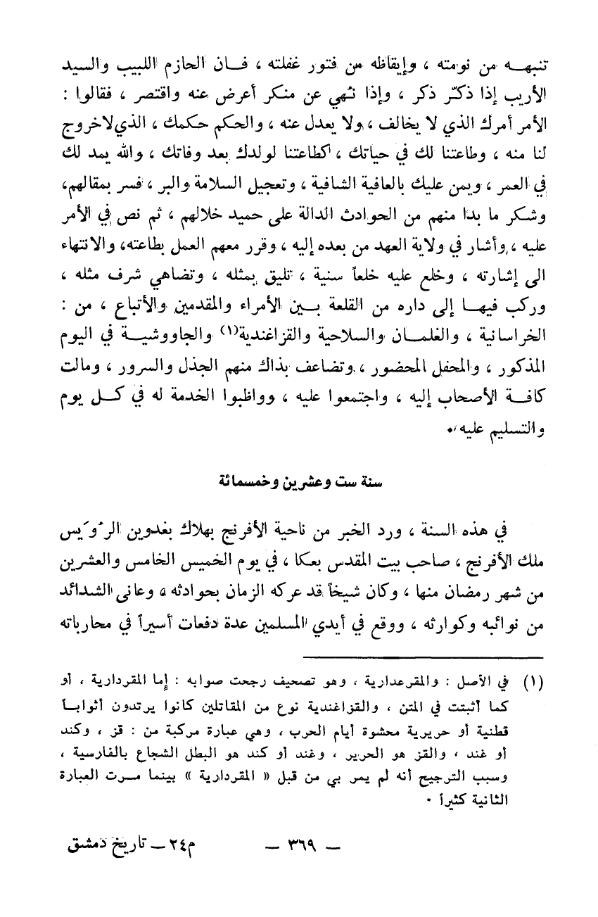 تنبهه من نومته وإيقاظه من فتور غفلته فإن الحازم اللبيب والسديد الأريب إذا ذكر ذكر وإذا أنهي عن منكر أعرض عنه واقتصر. فقالوا: الأمر أمرك الذي لا يخالف ولا يعدل عنه والحكم حكمك الذي لا خروج لنا منه وطاعتنا لك في حياتك كطاعتنا لولدك بعد وفاتك والله يمد لك في العمر ويمن عليك بالعافية الشافعية وتعجيل السلامة والبرء. فسر بمقالهم وشكر ما بدأ منهم من الحوادث الدالة على حميد خلالهم ثم نص في الأمر عليه وأشار في ولاية العهد من بعده إليه وقرر معهم العمل بطاعته والانتهاء إلى إشارته وخلع عليه خلعاً سنيةً تليق بمثله وتضاهي شرف مثله وركب فيها إلى داره من القلعة بين الأمراء والمقدمين والأتباع من الخراسانية والغلمان والسلاحية والمقرعدارية كذا والجاووشية في اليوم المذكور والمحفل المحضور وتضاعف بذاك منهم الجذل والسرور ومالت كافة الأصحاب إليه واجتمعوا عليه وواظبوا الخدمة له في كل يوم والتسليم عليه