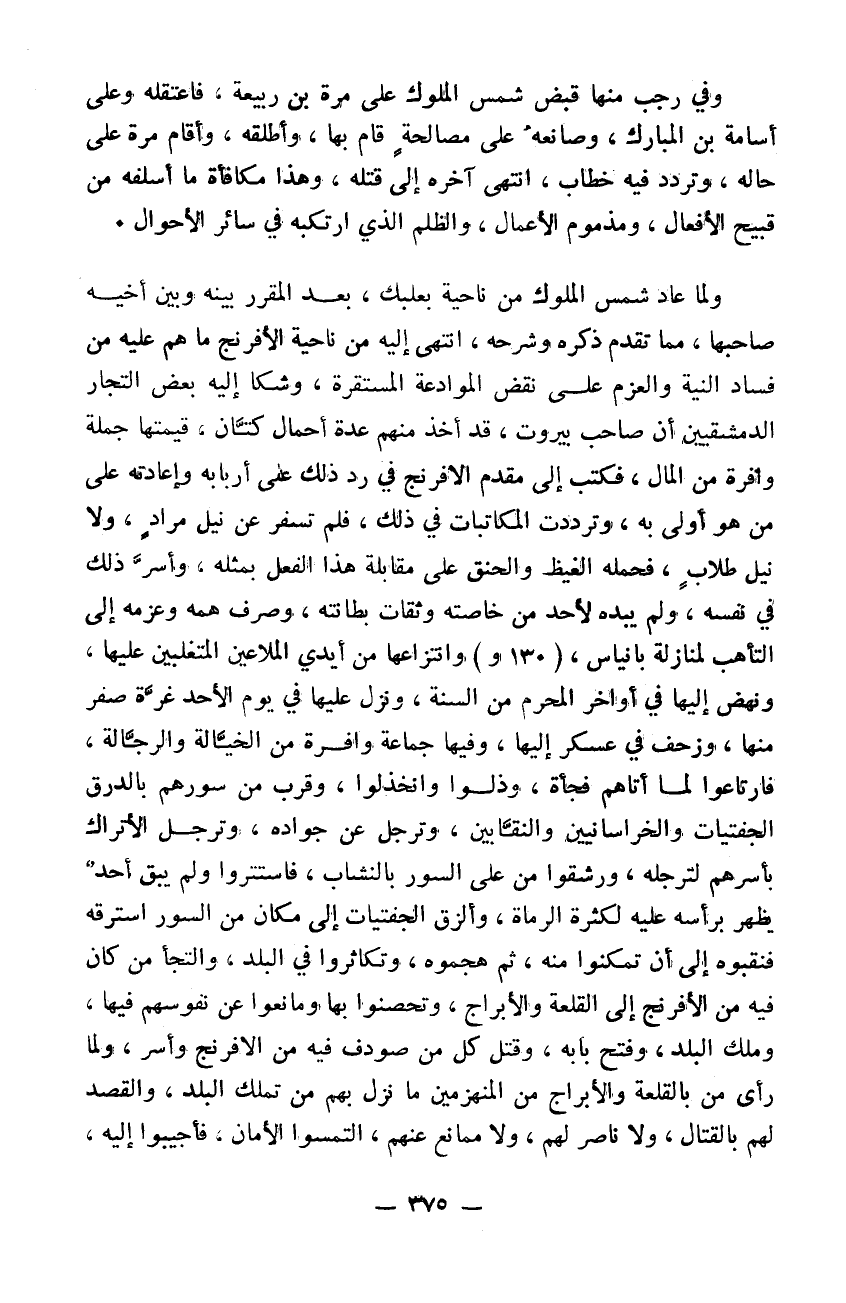 وفي رجب منها قبض شمس الملوك على مري بن ربيعة فاعتقله وعلى أسامة بن المبارك وصانعه على مصالحة قام بها وأطلقه وأقام مري على حاله وتردد فيه خطاب انتهى آخره إلى قتله وهذا مكافأة ما أسلفه من قبيح الأفعال ومذموم الأعمال والظلم الذي ارتكبه في سائر الأحوال ولما عاد شمس الملوك من ناحية بعلبك بعد المقرر بينه وبين أخيه صاحبها مما تقدم ذكره وشرحه انتهى إليه من ناحية الافرنج ما هم عليه من فساد النية والعزم على نقض الموادعة المستقرة. وشكا إليه بعض التجار الدمشقيين إن صاحب بيروت قد أخذ منهم عدة حمال كتان قيمتها جملة وافرة من المال فكتب إلى مقدم الافرنج في رد ذلك على أربابه وإعادته على من هو أولى به وترددت المكاتبات في ذلك فلم تسفر عن نيل مراد ولا نيل طلاب فحمله الغيظ والحنق على مقابلة هذا الفعل بمثله وأسر ذلك في نفسه ولم يبده لأحد من خاصته وثقات بطانته وصرف همه وعزمه إلى التأهب لمنازلة بانياس وانتزاعها من أيدي الملاعين المتغلبين عليها ونهض إليها في أواخر المحرم من السنة ونزل عليها في يوم الأحد غرة صفر منها وزحف في عسكر إليها وفيها جماعة وافرة من الخيالة والرجالة فارتاعوا لما أتاهم فجأةً وذلوا وانخذلوا وقرب من سورهم بالدرق الجفتيات والخراسانيين والنقابين وترجل عن جواده وترجل الأتراك بأسرهم لترجله ورشقوا من على السور بالنشاب فاستتروا ولم يبق أحد يظهر برأسه عليه لكثرة الرماة وألزق الجفتيات إلى مكان من السور استرقه فنقبوه إلى أن تمكنوا منه ثم هجموه وتكاثروا في البلد. والتجأ من كان فيه من الافرنج إلى القلعة والأبراج وتحصنوا بها ومانعوا عن نفوسهم فيها وملك البلد وفتح بابه وقتل كل من صودف فيه من الافرنج وأسر. ولما رأى من بالقلعة والأبراج من المنهزمين ما نزل بهم من تملك البلد والقصد لهم بالقتال ولا ناصر لهم ولا ممانع عنهم التمسوا الأمان فأجيبوا إليه