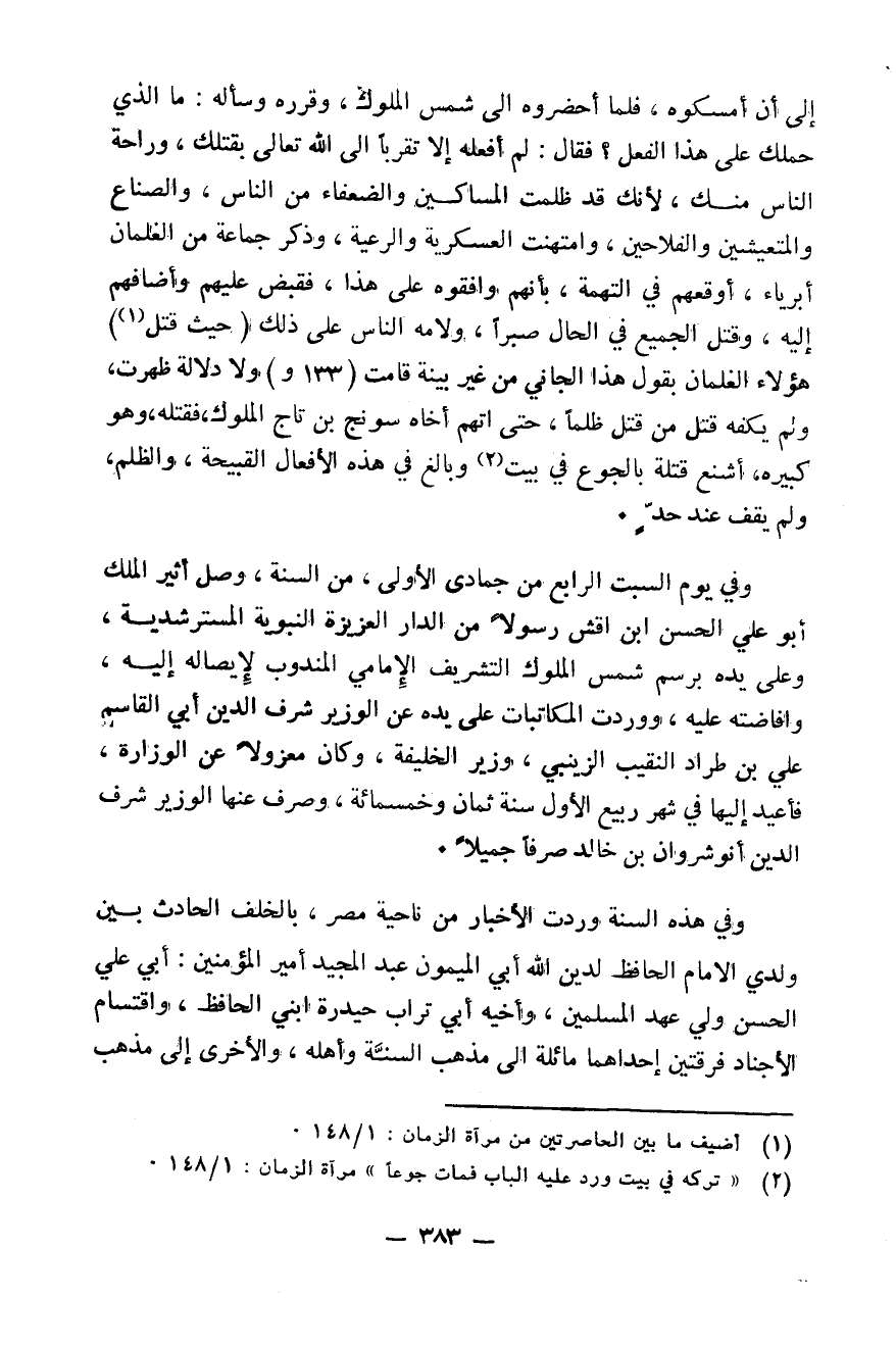 إلى أن أمسكوه فلما أحضروه إلى شمس الملوك وقرره وسأله: ما الذي حملك على هذا الفعل. فقال: لم أفعله إلا تقرباً إلى الله تعالى بقتلك وراحة الناس منك لأنك قد ظلمت المساكين والضعفاء من الناس والصناع والمتعيشين والفلاحين وامتهنت العسكرية والرعية. وذكر جماعةً من الغلمان أبرياء أوقعهم في التهمة بأنهم وافقوه على هذا فقبض عليهم وأضافهم إليه وقتل الجميع في الحال صبراً. ولامه الناس على ذلك حيث قتل هؤلاء الغلمان بقول هذا الجاني من غير بينة قامت ولا دلالة ظهرت ولم يكفه قتل من قتل ظلماً حتى اتهم أخاه سونج بن تاج الملوك فقتله وهو كبيره أشنع قتلة بالجوع في بيت وبالغ في هذه الأفعال القبيحة والظلم ولم يقف عند حد وفي يوم السبت الرابع من جمادى الأولى من السنة وصل أثير الملك أبو علي الحسن ابن اقش رسولاً من الدار العزيزة النبوية المسترشدية وعلى يده برسم شمس الملوك التشريف الامامي المندوب لإيصاله إليه وإفاضته عليه ووردت المكاتبات على يده عن الوزير شرف الدين أبي القسم علي بن طراد النقيب الزينبي وزير الخليفة وكان معزولاً عن الوزارة فأعيد إليها في شهر ربيع الأول سنة 528 وصرف عنها الوزير شرف الدين أنوشروان بن خالد صرفاً جميلاً وفي هذه السنة وردت الأخبار من ناحية مصر بالخلف الحادث بين ولدي الامام الحافظ لدين الله أبي الميمون عبد المجيد أمير المؤمنين أبي علي الحسن ولي عهد المسلمين وأخيه أبي تراب حيدرة ابني الحافظ واقتسام الأجناد فرقتين أحدهما مائلة إلى مذهب السنة وأهله والاخرى إلى مذهب