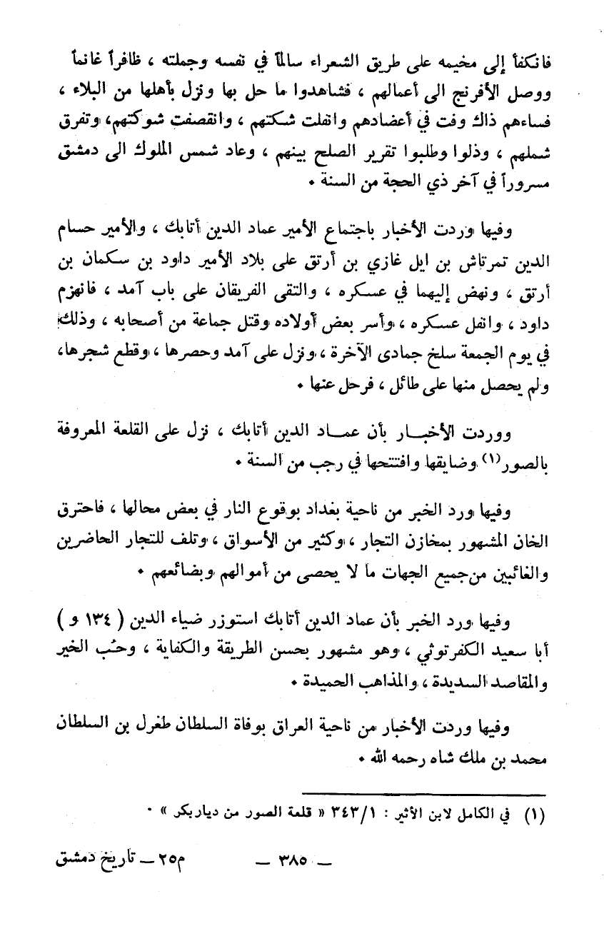 فانكفأ إلى مخيمه على طريق الشعراء سالماً في نفسه وجملته ظافراً غانماً. ووصل الافرنج إلى أعمالهم فشاهدوا ما حل بها ونزل بأهلها من البلاء فساءهم ذاك وفت في أعضادهم وانفلت شكتهم وانقصفت شوكتهم وتفرق شملهم وذلوا وطلبوا تقرير الصلح بينهم وعاد شمس الملوك إلى دمشق مسروراً في آخر ذي الحجة من السنة وفيها وردت الأخبار باجتماع الأمير عماد الدين أتابك والأمير حسام الدين تمرتاش ابن ايل غازي بن ارتق على بلاد الأمير داود بن سكمان بن ارتق ونهض إليهما في عسكره والتقى الفريقان على باب آمد فانهزم داود وانفل عسكره وأسر بعض أولاده وقتل جماعة من أصحابه وذلك في يوم الجمعة سلخ جمادى الآخرة ونزل على آمد وحصرها وقطع شجرها ولم يحصل منها على طائل فرحل عنها ووردت الأخبار بأن عماد الدين أتابك نزل على القلعة المعروفة بالصور وضايقها وافتتحها في رجب من السنة. وفيها ورد الخبر من ناحية بغداد بوقوع النار في بعض محالها فاحترق الخان المشهور بمخازن التجار وكثير من الأسواق وتلف للتجار الحاضرين والغائبين من جميع الجهات ما لا يحصى من أموالهم وبضائعهم. وفيها ورد الخبر بأن عماد الدين أتابك استوزر ضياء الدين أبا سعيد الكفرتوثي وهو مشهور بحسن الطريقة والكفاية وحب الخير والمقاصد السديدة والمذاهب الحميدة. وفيها وردت الأخبار من ناحية العراق بوفاة السلطان طغرل بن السلطان محمد بن ملك شاه رحمه الله.