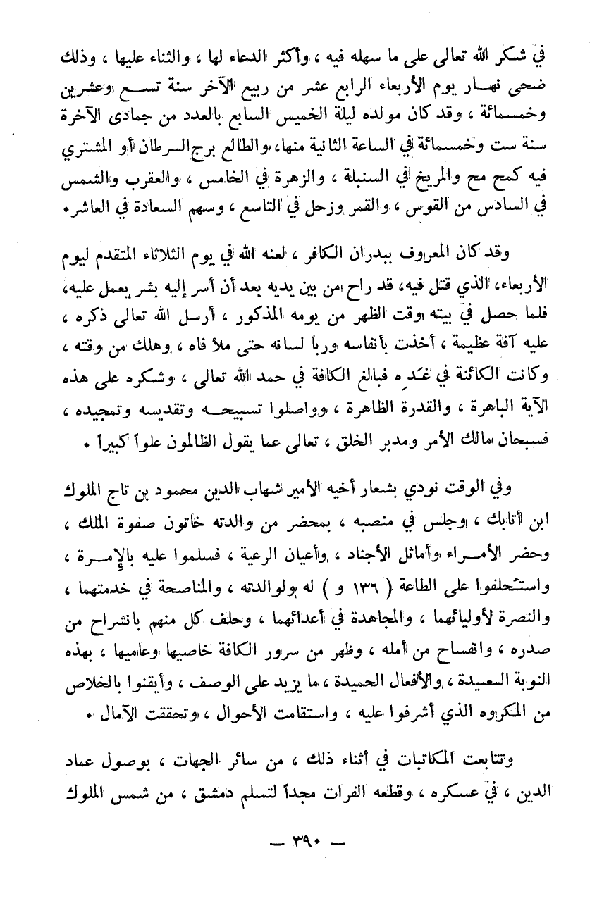 السادس من القوس والقمر وزحل في التاسع وسهم السعادة في العاشرسادس من القوس والقمر وزحل في التاسع وسهم السعادة في العاشر وقد كان المعروف ببدران الكافر لعنه الله في يوم الثلاثاء المتقدم ليوم الأربعاء الذي قتل فيه وقد راح من بين يديه بعد أن أسر إليه بشر يعمل عليه له. فلما حصل في بيته وقت الظهر من يومه المذكور أرسل الله تعالى ذكره عليه آفةً عظيمة أخذت بأنفاسه وربا لسانه حتى ملأ فاه وهلك من وقته وكانت الكائنة في غده فبالغ الكافة في حمد الله تعالى وشكره على هذه الآية الباهرة والقدرة الظاهرة وواصلوا تسبيحه وتقديسه وتمجيده فسبحان مالك الأمر ومدبر الخلق تعالى عما يقول الظالمون علواً كبيراً وفي الوقت نودي بشعار أخيه الأمير شهاب الدين محمود بن تاج الملوك بن أتابك جلس في منصبه بمحضر من والدته خاتون صفوة الملك وحضر الأمراء وأماثل الأجناد وأعيان الرعية فسلموا عليه بالامرة واستحلفوا على الطاعة له ولوالدته والمناصحة في خدمتهما والنصرة لأوليائهما والمجاهدة في أعدائهما وحلف كل منهم بانشراح من صدره وانفساح من أمله وظهر من سرور الكافة خاصيها وعاميها بهذه النوبة السعيدة والأفعال الحميدة ما يزيد على الوصف وأيقنوا بالخلاص من المكروه الذي أشرفوا عليه واستقامت الأحوال وتحققت الآمال وتتابعت المكاتبات في أثناء ذلك من سائر الجهات بوصول عماد الدين في عسكره وقطعه الفرات مجداً لتسلم دمشق من شمس الملوك
