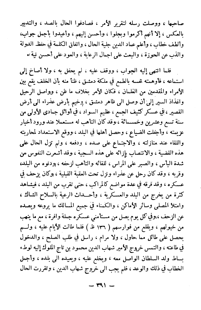 صاحبها ووصلت رسله لتقرير الأمر فصادفوا الحال بالضد والتدبير بالعكس إلا إنهم أكرموا وبجلوا وأحسن إليهم وأعيدوا بأجمل جواب وألطف خطاب وأعلم عماد الدين جلية الحال واتفاق الكلمة في حفظ الدولة والذب عن الحوزة والبعث على اجمال الرعاية والعود على أحسن نية فلما انتهى إليه الجواب ووقف عليه لم يحفل به ولا أصاخ إلى استماعه فأوهمته نفسه بالطمع في ملكة دمشق ظناً منه بأن الخلف يقع بين الأمراء والمقدمين من الغلمان فكان الأمر بخلاف ما ظن وواصل الرحيل وأغذاذ السر إلى أن وصل إلى ظاهر دمشق وخيم بأرض عذراء إلى أرض القصير في عسكر كثيف الجمع عظيم السواد في أوائل جمادى الأولى في سنة 519. وقد كان التأهب له مستعملاً عند ورود أخبار عزيمته وأجفلت الضياع وحصل أهلها في البلد ووقع الاستعداد لمحاربته واللقاء عند منازلته والاجتماع على صده ودفعه ولم تزل الحال على هذه القضية والانتصاب بإزائه على هذه السجية وقد أشعرت النفوس من شدة البأس والصبر على المراس للقائه والتأهب لزحفه ودنوه من البلد وقربه وقد كان رحل عن عذارء ونزل تحت العقبة القبلية وكان يزحف في عسكره وقد فرقه في عدة مواضع كالمراكب حتى تقرب من البلد فيشاهد كثرة من يخرج من البلد والعسكرية وأحداث الرعية بالسلاح الشاك وامتلأ المصلي وسائر الأماكن والكمناء في جميع المسالك ما يروعه ويصده عن الزحف وفي كل يوم يصل من مستأمني عسكره جملة وافرة مع ما ينهب من خيولهم ويقلع من فوارسهم فلما طالت الأيام عليه ولم يحصل على طائل مما حاول ولا مرام راسل في طلب الصلح والدخول في طاعته والتمس خروج الأمير شهاب الدين محمود بن تاج الملوك إليه لوطء بساط ولد السلطان الواصل معه ويخلع عليه ويعيده إلى بلده وأجمل الخطاب في ذلك والوعد فلم يجب إلى خروج شهاب الدين وتقررت الحال