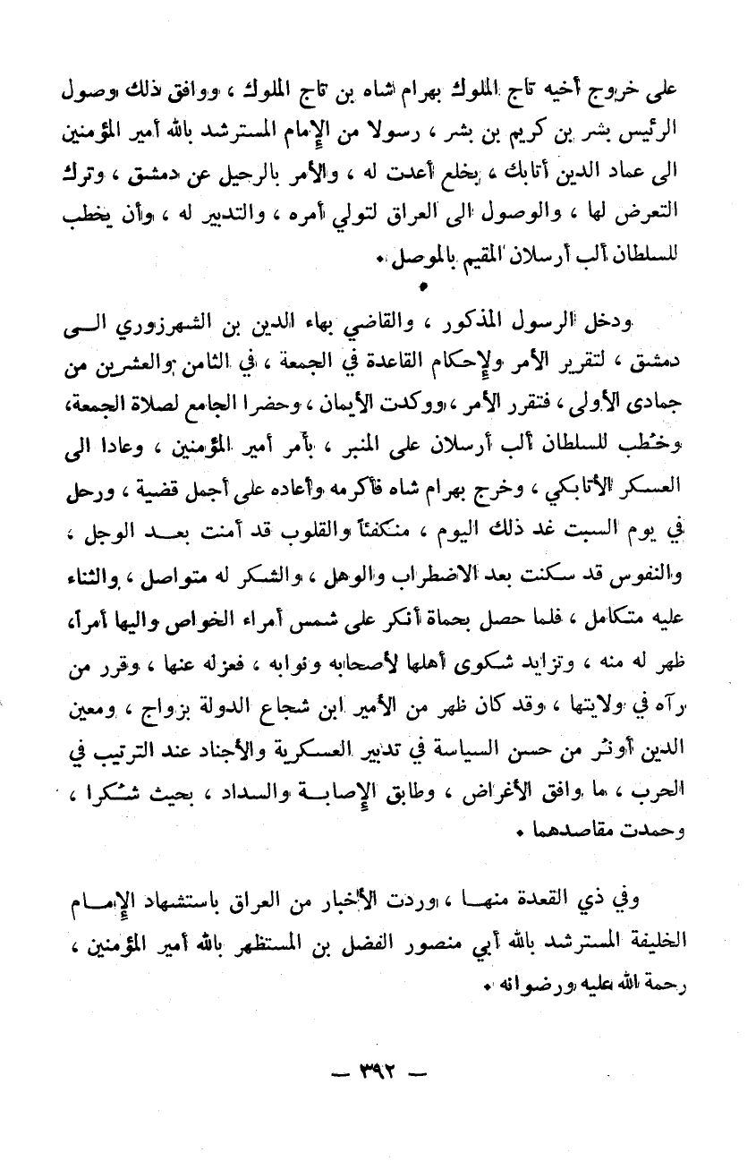 ودخل الرسول المذكور والقاضي بهاء الدين ابن الشهرزوري إلى دمشق لتقرير الأمر ولإحكام القاعدة في الجمعة في الثامن والعشرين من جمادى الأولى فتقرر الأمر ووكدت الايمان وحضرا الجامع لصلاة الجمعة وخطب للسلطان البارسلان على المنبر بأمر أمير المؤمنين وعاد إلى العسكر الأتابكي وخرج بهرام شاه فأكرمه وأعاده على أجمل قضية ورحل في يوم السبت غد ذلك اليوم منكفئاً والقلوب قد أمنت بعد الوجل والنفوس قد سكنت بعد الاضطراب والوهل والشكر له متواصل والثناء عليه متكامل. فلما حصل بحماة أنكر على شمس أمراء الخواص واليها أمراً أظهر له منه وتزايد شكوى أهلها لأصحابه ونوابه فعزله عنها وقرر من رآه في ولايتها. وقد كان ظهر من الأمير شجاع الدولة بزواج ومعين الدين أنر من حسن السياسة في تدبير العسكرية والأجناد عند الترتيب في الحرب ما وافق الأعراض وطابق الاصابة والسداد بحيث شكرا وحمدت مقاصدهما وفي ذي القعدة منها وردت الأخبار من العراق باستشهاد الامام الخليفة المسترشد بالله أبي منصور الفضل بن المستظهر بالله أمير المؤمنين رحمه الله عليه ورضوانه