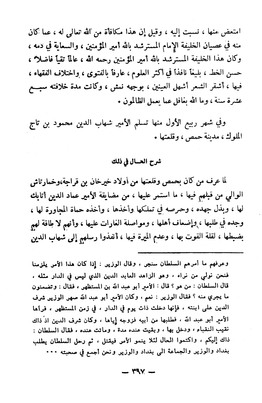 امتعض منها نسبت إليه وقيل إن هذا مكافأة من الله تعالى له عما كان منه في عصيان الخليفة الامام المسترشد بالله أمير المؤمنين والسعاية في دمه. وكان هذا الخليفة المسترشد بالله أمير المؤمنين رحمه الله عالماً تقياً فاضلاً حسن الخط بليغاً نافذاً في أكثر العلوم عارفاً بالفتوى واختلاف الفقهاء فيها أشقر الشعر أشهل العينين بوجهه نمش وكانت مدة خلافته سبع عشرة سنة وما الله بغافل عما يعمل الظالمون. وفي شهر ربيع الأول منها تسلم الأمير شهاب الدين محمود بن تاج الملوك مدينة حمص وقلعتها