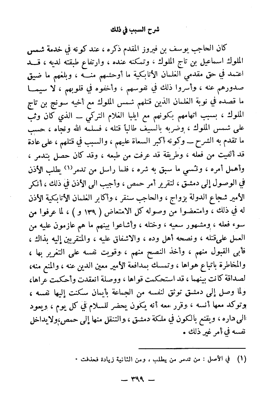 كان الحاجب يوسف بن فيروز المقدم ذكره عند كونه في خدمة شمس الملوك إسمعيل بن تاج الملوك وتمكنه عنده وارتفاع طبقته لديه قد اعتمد في حق مقدمي الغلمان الأتابكية ما أوحشهم منه وبلغهم ما ضيق صدورهم عنه وأسروا ذلك في نفوسهم وأخفوه في قلوبهم لا سيما ما قصده في نوبة الغلمان الذين قتلهم شمس الملوك مع أخيه سونج بن تاج الملوك بسبب اتهمهم بكونهم مع ايلبا الغلام التركي الذي كان وثب على شمس الملوك وضربه بالسيف طالباً قتله فسلمه الله منهم ونجاه حسب ما تقدم به الشرح وكونه أكبر السعاة عليهم والسبب في قتلهم على عادة قد ألفيت من فعله وطريقة قد عرفت من طبعه وقد كان حصل بتدمر وأهمل أمره ونسي ما سبق به شره. فلما راسل من تدمر من يطلب الأذن في الوصول إلى دمشق لتقرير أمر حمص وأوجب إلى الأذن في ذلك أنكر الأمير شجاع الدولة بزواج والحاجب سنقر وأكابر الغلمان الأتابكية الأذن له في ذلك وامتعضوا من وصوله كل الامتعاض لما عرفوا من سوء فعله ومشهور سعيه وختله وأشاعوا بينهم ما هم عازمون عليه من العمل على قتله. ونصحه أهل وده والاشفاق عليه والمتقربين إليه بذاك فأبى القبول منهم وأخذ النصح منهم وقويت نفسه على التغرير بها والمخاطرة باتباع هوائها. وتمسك بمدافعة الأمير معين الدين عنه والمنع منه لصداقة كانت بينهما قد استحكمت قواها ووصلة انعقدت وأحكمت عراها ولما وصل إلى دمشق توثق لنفسه من الجماعة بأيمان سكنت إليها نفسه وتوكد معها أنسه وقرر معه إنه يكون يحضر للسلام في كل يوم ويعود إلى داره ويقنع بالكون في ملكة دمشق والتنقل منها إلى حمص ولا يداخل نفسه في أمر غير ذلك