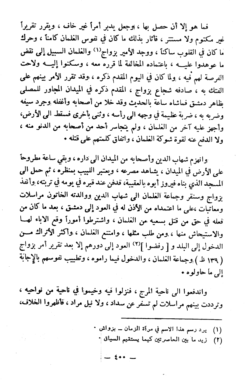 فما هو إلا إن حصل بها وجعل يدبر أمراً غير خاف ويقرر تقريراً غير مكتوم ولا مستتر فأثار بذلك ما كان في نفوس الغلمان كامناً وحرك ما كان في القلوب ساكناً. ووجد الأمير بزواج والغلمان السبيل إلى نقض ما عوهدوا عليه باعتماده المخالفة لما قرروه معه وسكنوا إليه ولاحت الفرصة لهم فيه ولما كان في يوم المقدم ذكره وقد تقرر الأمر بينهم على الفتك به صادفه شجاع الدولة بزواج المقدم ذكره في الميدان المجاور للمصلى بظاهر دمشق فماشاه ساعةً بالحديث وقد خلا من أصحابه وأغفله وجرد سيفه وضربه به ضربةً عظيمةً في وجهه إلى رأسه وثنى بأخرى فسقط إلى الأرض وأجهز عليه آخر من الغلمان ولم يتجاسر أحد من أصحابه من الدنو منه ولا الدفع عنه لقوة شوكة الغلمان واتفاق كلمتهم على قتله وانهزم شهاب الدين وأصحابه من الميدان إلى داره وبقي ساعةً مطروحاً على الأرض في الميدان يشاهد مصرعه ويعتبر اللبيب بمنظره ثم حمل إلى المسجد الذي بناه فيروز أبوه بالعقيبية فدفن عند قبره في يومه في تربته. وأنفذ بزواج وسنقر وجماعة الغلمان إلى شهاب الدين ووالدته الخاتون مراسلات ومعاتبات على ما اعتمداه من الأذن له في العود إلى دمشق بعد ما كان من فعله في حق من قتل بسعيه من الغلمان واشترطوا أموراً وقع الآباء لها والاستيحاش منها ومن طلب مثلها وامتنع الغلمان وأكثر الأتراك من الدخول إلى البلد والعود إلى دورهم إلا بعد تقرير أمر بزواج وجماعة الغلمان والدخول فيما راموه وتطييب نفوسهم بالاجابة إلى ما حاولوه واندفعوا إلى ناحية المرج فنزلوا فيه وخيموا في ناحية من نواحيه وترددت بينهما مراسلات لم تسفر عن سداد ولا نيل مراد فأظهروا الخلاف