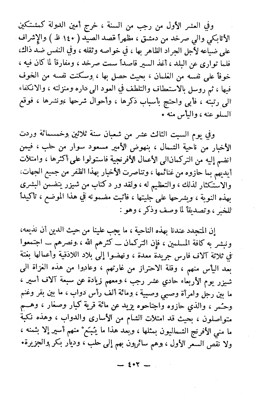 وفي يوم السبت الثالث عشر من شعبان سنة 530 وردت الأخبار من ناحية الشمال بنهوض الأمير مسعود سوار من حلب فيمن انضم إليه من التركمان إلى الأعمال الافرنجية فاستولوا على أكثرها وامتلأت أيديهم بما حازوه من غنائمها وتناصرت الأخبار بهذا الظفر من جميع الجهات والاستكثار لذلك والتعظيم له ولقد ورد كتاب من شيزر يتضمن البشرى بهذه النوبة ويشرحها على جليتها فأثبت مضمونه في هذا الموضع تأكيداً للخبر وتصديقاً لما وصف وذكر وهو: إن المتجدد عندنا بهذه الناحية ما يجب علينا من حيث الدين أن نذيعه ونبشر به كافة المسلمين فإن التركمان كثرهم الله ونصرهم اجتمعوا في ثلاثة ألف فارس جريدةً معدةً ونهضوا إلى بلاد اللاذقية وأعمالها بغتةً بعد اليأس منهم وقلة الاحتراز من غارتهم وعادوا من هذه الغزاة إلى شيزر يوم الأربعاء حادي عشر رجب ومعهم زيادة عن سبعة ألف أسير ما بين رجل وامرأة وصبي وصبية ومائة ألف رأس دواب ما بين بقر وغنم وخيل وحمر والذي حازوه واحتاجوه يزيد عن مائة قرية كبار وصغار وهم متواصلون بحيث قد امتلأت الشام من الأسارى والدواب. وهذه نكبة ما مني الافرنج الشماليون بمثلها وبعد هذا لا يبع منهم أسير إلا بثمنه ولا نقص السعر الأول وهم سائرون بهم إلى حلب وديار بكر والجزيرة