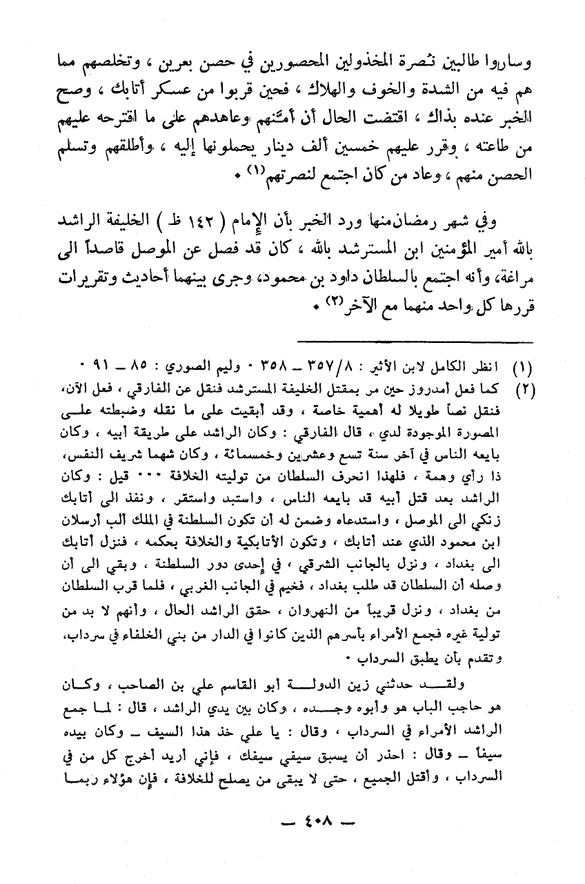 وساروا طالبين نصرة المخذولين المحصورين في حصن بعرين وتخلصهم مما هم فيه من الشدة والخوف والهلاك فحين قربوا من عسكر أتابك وصح الخبر عنده بذاك اقتضت الحال إن أمنهم وعاهدهم على ما اقترحه عليهم من طاعته وقرر عليهم خمسين ألف دينار يحملونها إليه وأطلقهم وتسلم الحصن منهم وعاد من كان اجتمع لنصرتهم وفي شهر رمضان منها ورد الخبر بأن الامام الخليفة الراشد بالله أمير المؤمنين ابن المسترشد بالله كان قد فصل عن الموصل قاصداً إلى مراغة وإنه اجتمع بالسلطان داود بن محمود وجرى بينهما أحاديث وتقريرات قررها كل واحد منهما مع الآخر.