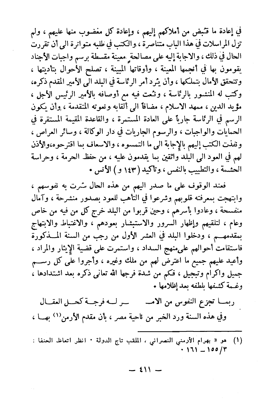 في إعادة ما قبض من أملاكهم إليهم وإعادة كل مغصوب منها عليهم ولم تزل المراسلات في هذا الباب متناصرة والكتب في طلبه متواترة إلى أن تقررت الحال في ذلك والاجابة إليه على مصالحة معينة مقسطة برسم واجبات الأجناد يقومون بها في أنجمها المعينة وأوقاتها المبينة تصلح الأحوال بتأديها وتتحقق الآمال بتملكها وإن يرد أمر الرئاسة في البلد إلى الأمير المقدم ذكره وكتب له المنشور بالرئاسة ونعت فيه مع أوصافه بالأمير الرئيس الأجل مؤيد الدين ممهد الاسلام مضافاً إلى ألقابه ونعوته المتقدمة وأن يكون الرسم في الرئاسة جارياً على العادة المستمرة والقاعدة المقيمة المستقرة في الحمايات والواجبات والرسوم الجاريات في دار الوكالة وسائر العراض ونفذت الكتب إليهم بالاجابة إلى ما التمسوه والاسعاف بما اقترحوه والاذن لهم في العود إلى البلد واثقين بما يقدمون عليه من حفظ الحرمة وحراسة الحشمة والتطييب بالنفس وتأكيد الأنس. فعند الوقوف على ما صدر إليهم من هذه الحال سرت به نفوسهم وابتهجت بمعرفته قلوبهم وشرعوا في التأهب للعود بصدور منشرحة وآمال منفسحة وعادوا بأسرهم وحين قربوا من البلد خرج كل من فيه من خاص وعام لتلقيهم وإظهار السرور والاستبشار بعودهم والاغتباط والابتهاد بمقدمهم ودخلوا البلد في العشر الأول من رجب من السنة المذكورة فاستقامت أحوالهم على منهج السداد واستمرت على قضية الايثار والمراد وأعيد عليهم جميع ما اعترض لهم من ملك وغيره وأجروا على كل رسم جميل واكرام وتبجيل. فكم من شدة فرجها الله تعالى ذكره بعد اشتدادها وغمة كشفها بلطفه بعد اظلامها