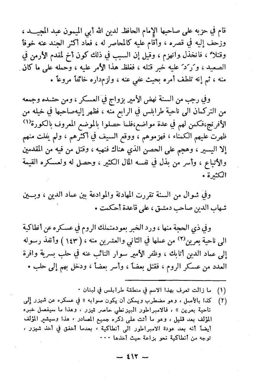 قام في حزبه على صاحبها الامام الحافظ لدين الله أبي الميمون عبد المجيد وزحف إليه في قصره وأقام عليه كالمحاصر له فعاد أكثر الجند عنه خوفاً وقتلاً فانخذل وانهزم. وقيل إن السبب في ذلك كون أخ لمقدم الأرمن في الصعيد ورد عليه خبر قتله فغلظ هذا الأمر عليه وحمله على ما كان منه ثم إنه تلطف أمره بحيث عفي عنه ولزم داره خائفاً مروعاً وفي رجب من السنة نهض الأمير بزواج في العسكر ومن حشده وجمعه من التركمان إلى ناحية طرابلس في الرابع منه فظهر إليه صاحبها في خيله من الافرنج فكمن لهم في عدة مواضع فلما حصلوا بالموضع المعروف بالكورة ظهرت عليهم الكمناء فهزموهم ووقع السيف في أكثرهم ولم يفلت منهم إلا اليسير وهجم على الحصن الذي هناك فنهبه وقتل من فيه من المقدمين والأتباع وأسر من بذل في نفسه المال الكثير وحصل له ولعسكره القيمة الكثيرة وفي شوال من السنة تقررت المهادنة والموادعة بين عماد الدين وبين شهاب الدين صاحب دمشق على قاعدة أحكمت. وفي ذي الحجة منها ورد الخبر بعود متملك الروم في عسكره عن انطاكية إلى ناحية بعرين من عملها في الثاني والعشرين منه وأنفذ رسوله إلى عماد الدين أتابك وظفر الأمير سوار النائب عنه في حلب بسرية وافرة العدد من عسكر الروم فقتل بعضاً وأسر بعضاً ودخل بهم إلى حلب