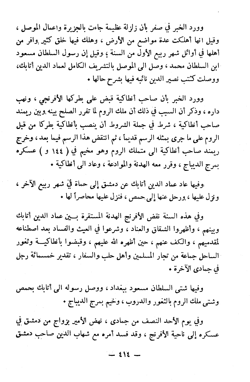 وورد الخبر في صفر بأن زلزلة عظيمة جاءت بالجزيرة وأعمال الموصل وقيل أنها أهلكت عدة مواضع من الأرض وهلك فيها خلق كثير وافر من أهلها. وفي أوائل شهر ربيع الأول من السنة وقيل أن رسول السلطان مسعود بن السلطان محمد ووصل إلى الموصل بالتشريف الكامل لعماد الدين أتابك ووصلت كتب نصير الدين نائبه فيها يشرح حالها وورد الخبر بأن صاحب أنطاكية قبض على بطركها الافرنجي ونهب داره وذكر أن السبب في ذلك أن ملك الروم لما تقرر الصلح بينه وبين ريمند صاحب أنطاكية شرط في جملة الشروط أن ينصب بأنطاكية بتركاً كذا من قبل الروم على ما جرى بمثله الرسم قديماً ثم انتقض هذا الرسم فيما بعد وخرج ريمند صاحب أنطاكية إلى متملك الروم وهو مخيم في عسكره بمرج الديباج وقرر معه الهدنة والموادعة وعاد إلى أنطاكية. وفيها عاد عماد الدين أتابك عن دمشق إلى حماة في شهر ربيع الآخر ونزل عليها ورحل عنها إلى حمص فنزل عليها محاصراً لها وفي هذه السنة نقض الافرنج الهدنة المستقرة بين عماد الدين أتابك وبينهم وأظهروا الشقاق والعناد وشرعوا في العيث والفساد بعد اصطناعه لمقدميهم والكف عنهم حين أظهره الله عليه وقبضوا بأنطاكية وثغور الساحل جماعةً من تجار المسلمين وأهل حلب والسفار تقدير خمسمائة رجل في جمادى الآخرة وفيها شتى السلطان مسعود ببغداد ووصل رسوله إلى أتابك بحمص وشتى ملك الروم بالثغور والدروب وخيم بمرج الديباج. وفي يوم الأحد النصف من جمادى نهض الأمير بزواج من دمشق في عسكره إلى ناحية الافرنج وقد فسد أمره مع شهاب الدين صاحب دمشق