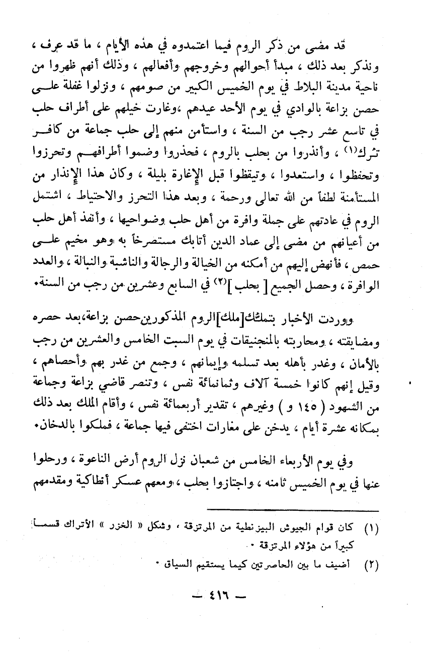 قد مضى من ذكر الروم فيما اعتمدوه في هذه الأيام ما قد عرف ويذكر بعد ذلك مبدأ أحوالهم وخروجهم وأفعالهم وذلك أنهم ظهروا من ناحية مدينة البلاط في يوم الخميس الكبير من صومهم ونزلوا غفلةً على حصن بزاعة بالوادي في يوم الأحد عندهم وغارت خيلهم على أطراف حلب في تاسع عشر رجب من السنة واستأمن منهم إلى حلب جماعة من كافر ترك وأنذروا من بحلب بالروم فحذروا وضموا أطرافهم وتحرزوا وتحفظوا استعدوا وتيقظوا قبل الاغارة بليلة وكان هذا الانذار من المستأمنة لطفاً من الله تعالى ورحمةً. وبعد هذا التحرز والاحتياط اشتمل الروم في عادتهم على جملة وافرة من أهل حلب وضواحيها وأنفذ أهل حلب من أعيانهم من مضى إلى عماد الدين أتابك مستصرخا به وهو مخيم على حمص فانهض إليهم من أمكنه من الخيالة والرجالة والناشبة والنبالة والعدد الوافرة وحصل الجميع في السابع وعشرين من رجب من السنة ووردت الأخبار بتملك الروم المذكورين حصن بزاعة بعد حصره ومضايقته ومحاربته بالمنجنيقات في يوم السبت الخامس والعشرين من رجب بالأمان وغدر بأهله بعد تسلمه وأيمانهم وجمع من غدر بهم وأحصاهم وقيل أنهم كانوا خمسة ألف وثمانمائة نفس وتنصر قاضي بزاعة وجماعة من الشهود وغيرهم تقدير أربعمائة نفس وأقام الملك بعد ذلك بمكانه عشرة أيام يدخن على مغارات اختفى فها جماعة فملكوا بالدخان وفي يوم الأربعاء الخامس من شعبان نزل الروم أرض الناعورة ورحلوا عنها في يوم الخميس ثامنه واجتازوا بحلب ومعهم عسكر أنطاكية ومقدمهم