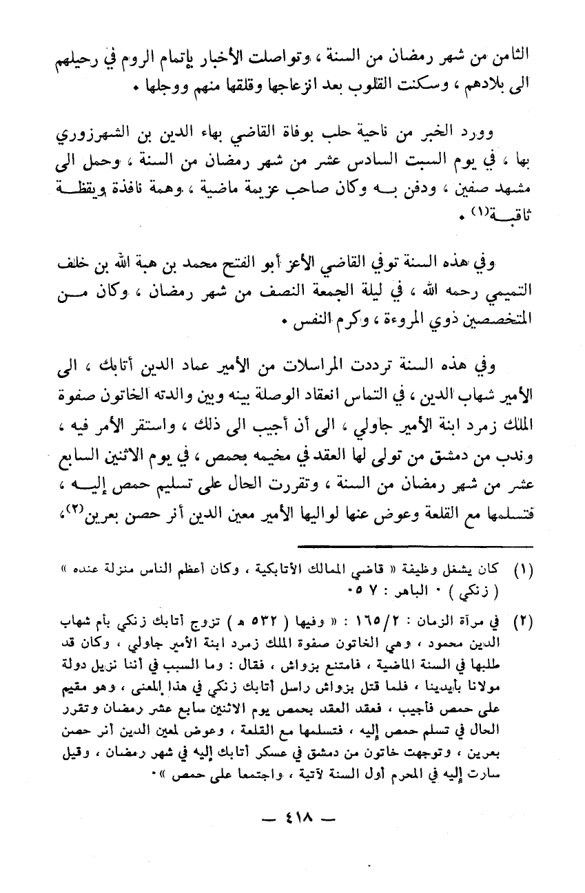 الثامن من شهر رمضان من السنة وتواصلت الأخبار باتمام الروم في رحيلهم إلى بلادهم وسكنت القلوب بعد انزعاجها وقلقها منهم ووجلها وورد الخبر من ناحية حلب بوفاة القاضي بهاء الدين ابن الشهرزوري بها في يوم السبت السادس عشر من شهر رمضان من السنة وحمل إلى مشهد صفين ودفن به وكان صاحب عزيمة ماضية وهمة نافذة ويقظة ثاقبة. وفي هذه السنة توفي القاضي الأعز أبو الفتح محمد بن هبة الله بن خلف التميمي رحمه الله في ليلة الجمعة النصف من شهر رمضان وكان من المتخصصين ذوي المروة وكرم النفس