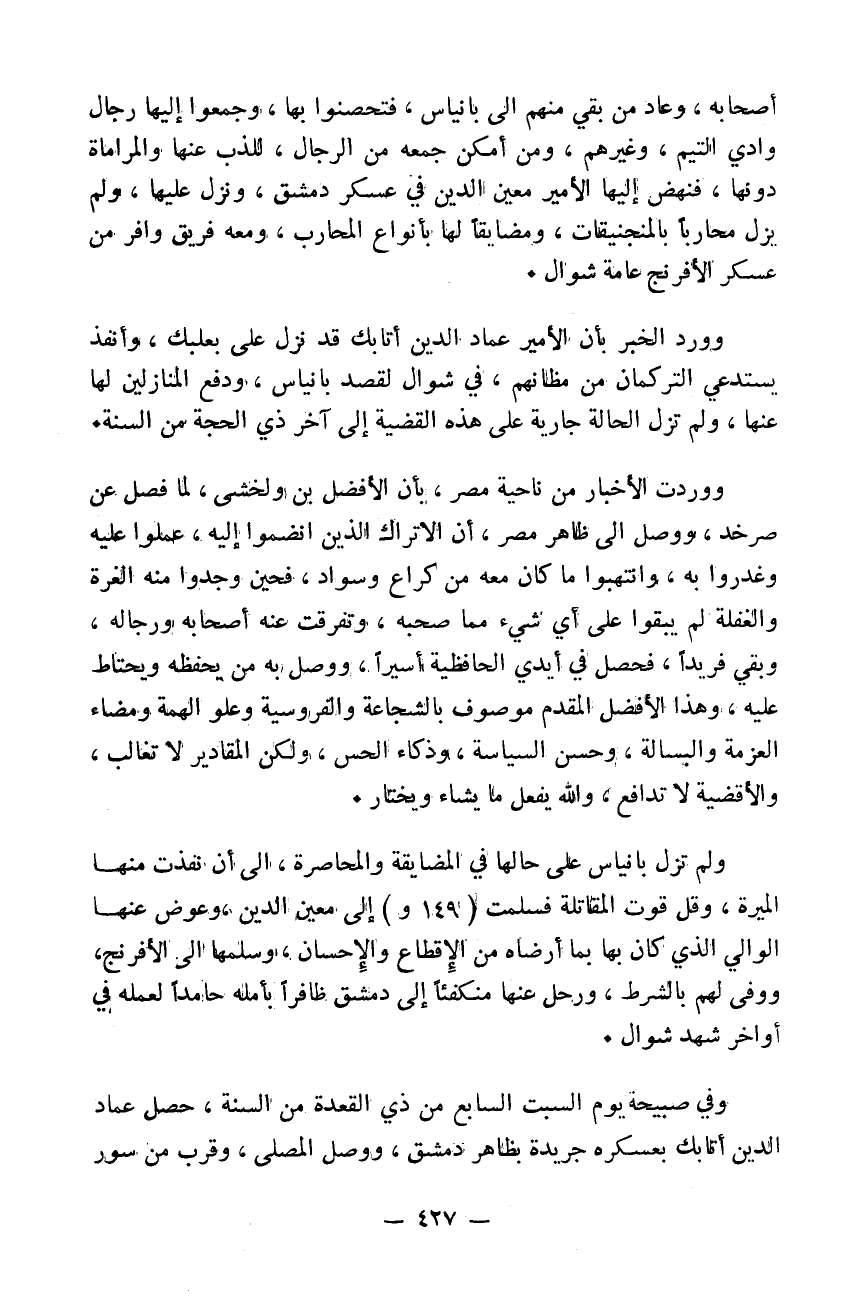 أصحابه وعاد من بقي منهم إلى بانياس فتحصنوا بها وجمعوا إليها رجال وادي التيم وغيرهم ومن أمكن جمعه من الرجال للذب عنها والمراماة دونها فنهض إليها الأمير معين الدين في عسكر دمشق ونزل عليها ولم يزل محارباً بالمنجنيقات ومضايقاً لها بأنواع المحاربات ومعه فريق وافر من عسكر الافرنج عامة شوال وورد الخبر بأن الأمير عماد الدين أتابك قد نزل على بعلبك وأنفذ يستدعي التركمان من مطانهم كذا في شوال لقصد بانياس ودفع المنازلين لها عنها ولم تزل الجالية جارية على هذه القضية إلى آخر ذي الحجة من السنة ووردت الأخبار من ناحية مصر بأن الأفضل بن ولخشي لما فصل عن صرخد ووصل إلى ظاهر مصر أن الأتراك الذين انضموا إليه عملوا عليه وغدروا به وانتهبوا ما كان معه من كراع وسواد فحين وجدوا منه الغرة والغفلة لم يبقوا على شيء مما صحبه وتفرقت عنه أصحابه ورجاله وبقي فريداً فحصل في أيدي الحافظية أسيراً ووكل به من يحفظه ويحتاط عليه وهذا الأفضل المقدم موصوف بالشجاعة والفروسية وعلو الهمة ومضاء العزمة والبسالة وحسن السياسة وذكاء الحس ولكن المقادير لا تغالب والأقضية لا تدافع والله يفعل ما يشاء ويختار. ولم تزل بانياس على حالها في المضايقة والمحاصرة إلى أن نفدت منها الميرة وقل قوت المقاتلة فسلمت إلى معين الدين وعوض عنها الوالي الذي كان بها بما أرضاه من الاقطاع والاحسان وسلمها إلى الافرنج ووفى لهم بالشروط ورحل عنها منكفئاً إلى دمشق ظافراً بأمله خامداً لعمله في أواخر شهر شوال وفي صبيحة يوم السبت السابع من ذي القعدة من السنة حصل عماد الدين أتابك بعسكره جريدةً بظاهر دمشق ووصل المصلى وقرب من سور