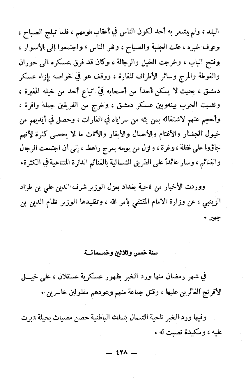 البلد ولم يشعر به أحمد لكون الناس في أعقاب نومهم فلما تبلج الصباح وعرف خبره علت الجلبة والصياح ونفر الناس واجتمعوا إلى الأسوار وفتح الباب وخرجت الخيل والرجالة وكان قد فرق عسكره إلى حوران والغوطة والمرج وسائر الأطراف للغارة ووقف هو في خواصه بازاء عسكر دمشق بحيث لا يمكن أحداً من أصحابه في اتباع أحد من خيله المغيرة ونشبت الحرب بينه وبين عسكر دمشق وخرج من الفريقين جملة وافرة وأحجم عنهم لاشتغاله بمن بثه من سراياه في الغارات وحصل في أيديهم من خيول الجشار والأغنام والأحمال والأبقار والأثاث ما لا يحصى كثرةً لأنهم جاءوا على غفلة وغرة ونزل من يومه بمرج راهط إلى أن اجتمعت الرجال والغنائم وسار عائداً على الطريق الشمالية بالغنائم الدثرة المتناهية في الكثرة ووردت الأخبار من ناحية بغداد بعزل الوزير شرف الدين علي بن طراد الزينبي عن وزارة الامام المقتفي بأمر الله وتقليدها الوزير نظام الدين ابن جهير