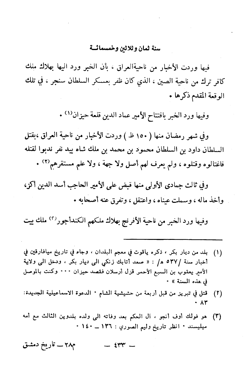 فيها وردت الأخبار من ناحية العراق بأن الخبر ورد إليها بهلاك ملك كافرترك من ناحية الصين الذي كان ظفر بعسكر السلطان سنجر في تلك الوقعة المقدم ذكرها. وفيها ورد الخبر بافتتاح الأمير عماد الدين قلعة حيزان. وفي شهر رمضان منها وردت الأخبار من ناحية العراق بقتل السلطان داود ابن السلطان محمود بن محمد بن ملك شاه بيد نفر ندبوا لقتله فاغتالوه وقتلوه ولم يعرف لهم أصل ولا جهة ولا علم مستقرهم. وفي ثالث جمادى الأولى منها قبض على الأمير الحاجب أسد الدين أكثر وأخذ ماله وسملت عيناه واعتقل وتفرق عنه أصحابه. وفيها ورد الخبر من ناحية الافرنج بهلاك ملكهم الكند ايجور ملك بيت