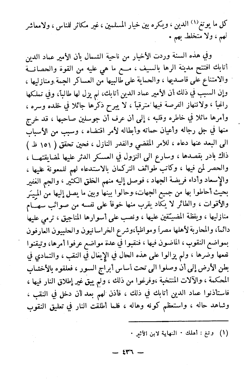 وفي هذه السنة وردت الأخبار من ناحية للشمال بأن الأمير عماد الدين أتابك افتتح مدينة الرها بالسيف مع ما هي عليه من القوة والحصانة والامتناع على قاصديها والحماية على طالبيها من العساكر الجمة ومنازلتها وأن السبب في ذلك أن الأمير عماد الدين أتابك لم يزل لها طالباً وفي تملكها راغباً ولانتهاز الفرصة فيها مترقباً لا يبرح ذكرها جائلاً في خلده وسره وأمرها ماثلاً في خاطره وقلبه إلى أن عرف أن جوسلين صاحبها قد خرج منها في جل رجاله وأعيان حماته وابطاله لأمر اقتضاه وسبب من أسباب إلى البعد عنها دعاه للأمر المقضي والقدر النازل فحين تحقق ذاك بادر بقصدها وسارع إلى النزول في العسكر الدثر عليها لمضايقتها والحصر لمن فيها وكاتب طوائف التركمان بالاستدعاء لهم للمعونة عليها والاسعاد وأداء فريضة الجهاد فوصل إليه منهم الخلق الكثير والجم الغفير بحيث أحاطوا بها من جميع الجهات وحالوا بينها وبين ما يصل إليها من المير والأقوات والطائر لا يكاد يقرب منها خوفاً على نفسه من صوائب سهام منازليها ويقظة المضيقين عليها ونصب على أسوارها المناجيق ترمي عليها دائماً والمحاربة لأهلها مضراً ومواظباً. وشرع الخراسانيون والحلبيون العارفون بمواضع النقوب الماضون فيها فنقبوا في عدة مواضع عرفوا أمرها وتيقنوا نفعها وضرها ولم يزالوا على هذه الحال في الايغال في النقب والتمادي في بطن الأرض إلى أن وصلوا إلى تحت أساس أبراج السور فعلقوه بالأخشاب المحكمة والآلات المنتخبة وفرغوا من ذلك ولم يبق غير اطلاق النار فيها. فاستأذنوا عماد الدين أتابك في ذلك فأذن لهم بعد أن دخل في النقب وشاهد حاله واستعظم كونه وهاله. فلما أطلقت النار في تعليق النقوب