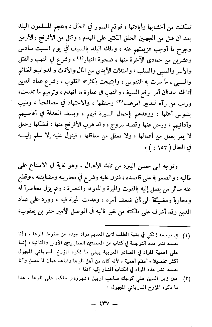 تمكنت من أخشابها وابادتها فوقع السور في الحال وهجم المسلمون البلد بعد أن قتل من الجهتين الخلق الكثير على الهدم وقتل من الافرنج والأرمن وجرح ما أوجب هزيمتهم عنه وملك البلد بالسيف في يوم السبت سادس وعشرين من جمادى الآخرة منها ضحوة النهار. وشرع في النهب والقتل والأسر والسبي وامتلأت الأيدي من المال والأثاث والدواب والغنائم والسبي ما سرت به النفوس وابتهجت بكثرته القلوب وشرع عماد الدين أتابك بعد أن أمر برفع السيف والنهب في عمارة ما انهدم وترميم ما تشعث ورتب من رآه لتدبير أمرها وحفظها والاجتهاد في مصالحها وطيب بنفوس أهلها ووعدهم باجمال السيرة فيهم وبسط المعدلة في أقاصيهم وأدانيهم. ورحل عنها وقصد سروج وقد هرب الافرنج منها فملكها وجعل لا يمر بعمل من أعمالها ولا معقل من معاقلها فينزل عليه إلا سلم إليه في الحال وتوجه إلى حصن البيرة من تلك الأعمال وهو غاية في الامتناع على طالبه والصعوبة على قاصده فنزل عليه وشرع في محاربته ومضايقته وقطع عنه سائر من يصل إليه بالقوت والميرة والمعونة والنصرة ولم يزل محاصراً له ومحارباً ومضيقاً إلى أن ضعف أمره وعدمت الميرة فيه. وورد على عماد الدين وقد أشرف على ملكته من خبر نائبه في الموصل الأمير جقر بن يعقوب