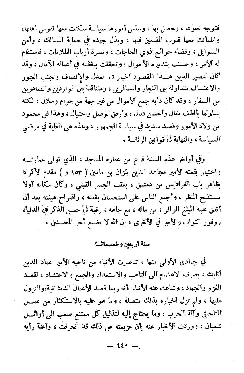 فتوجه نحوها وحصل بها واس أمورها سياسةً سكنت معها نفوس أهلها واطمأنت معها قلوب المقيمين فيها وبذل جهده في حماية المسالك وأمن السوابل وقضاء حوائج ذوي الحاجات ونصرة أرباب الظلامات فاستقام له الأمر وحسنت بتدبيره الأحوال وتحققت بيقظته في أعماله الآمال. وقد كان لنصير الدين هذا المقصود أخبار في العدل والانصاف وبجنب الجور والاعتساف متداولةً بين التجار والمسافرين ومتناقلةً بين الواردين والمصادرين من السفار وقد كان دأبه جمع الأموال من غير جهة عن حرام وحلال لكنه يتناولها بألطف مقال وأحسن فعال وأرفق توصل واحتيال وهذا فن محمود من ولاة الأمور وقصد سديد في سياسة الجمهور وهذه هي الغاية في مرضي السياسة والنهاية في قوانين الرئاسة وفي أواخر هذه السنة فرغ من عمارة المسجد الذي تولى عمارته واختيار بقعته الأمير مجاهد الدين بزان بن مامين مقدم الأكراد بظاهر باب الفراديس من دمشق بعقب الجسر القبلي وكان مكانه أولاً مستقبح المنظر وأجمع الناس على استحسان بقعته واقتراح هيئته بعد أن أنفق عليه المبلغ الوافر من ماله مع جاهه رغبةً في حسن الذكر في الدنيا ووفور الثواب والأجر في الأخرى. إن الله لا يضيع أجر المحسنين