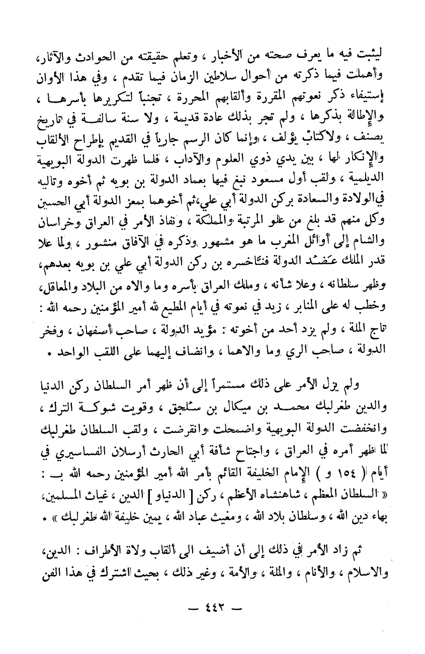 ليثبت فيه ما يعرف صحته من الأخبار وتعلم حقيقته من الحوادث والآثار. وأهملت فيما ذكرته من أحوال سلاطين الزمان فيما تقدم وفي هذا الأوان استيفاء ذكر نعوتهم المقررة وألقابهم المحررة تجنباً لتكريرها بأسرها والاطالة بذكرها لم تجر بذلك عادة قديمة ولا سنة سالفة في تاريخ يصنف ولا كتاب يؤلف وإذا كان الرسم جارياً في القديم باطراح الألقاب والانكار لها بين ذوي العلوم والآداب. فلما ظهرت الدولة البويهية الديلمية ولقب أول مسعود نبع فيها بعماد الدولة بن بويه ثم أخوه وتلوه في الولادة والسعادة بركن الدولة أبي علي ثم أخوهما بمعز الدولة أبي الحسين وكل منهم قد بلغ من علو المرتبة والمملكة ونفاذ الأمر في العراق وخراسان والشام في أوائل المغرب ما هو مشهور وذكره في الآفاق منشور. ولما علا قدر الملك عضد الدولة فناخسره بن ركن الدولة أبي علي بن بويه بعدهم وظهر سلطانه وعلا شأنه وملك العراق بأسره وما والاه من البلاد والمعاقل وخطب له على المنابر وزيد في نعوته في أيام المطيع لله أمير المؤمنين رحمه الله تاج الملة ولم يزد أحد من أخوته مؤيد الدولة صاحب أصفهان وفخر الدولة صاحب الرأي وما والاهما وانضاف إليهما على اللقب الواحد. ولم يزل الأمر على ذلك مستمراً إلى أن ظهر أمر السلطان ركن الدنيا والدين طغرلبك محمد بن ميكال بن سلجوق وقويت شوكة الترك وانخفضت الدولة البويهية واضمحلت وانقرضت ولقب السلطان طغرلبك ولما ظهر أمره في العراق واجتاح شأفة أبي الحرث أرسلان الفساسيري في أيام الامام الخليفة القائم بأمر الله أمير المؤمنين رحمه الله بالسلطان المعظم شاهنشاه الأعظم ركن الدين غياث المسلمين بهاء دين الله وسلطان بلاد الله ومغيث عباد الله يمين خليفة الله طغرلبك. ثم زاد الأمر في ذلك إلى أن أضيف إلى القاب ولاة الأطراف الدين والاسلام والأنام والملة والأمة وغير ذلك بحيث اشترك في هذا الفن