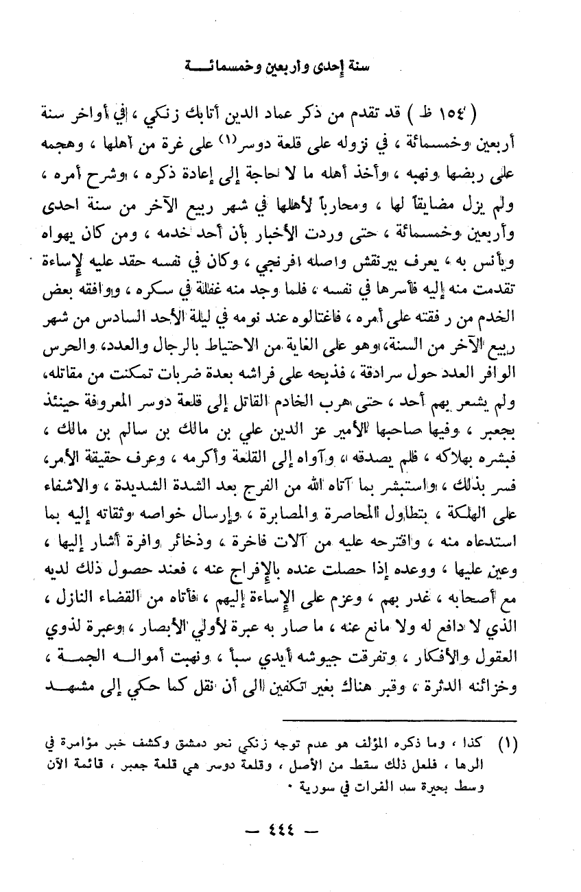 قد تقدم من ذكر عماد الدين أتابك زنكي في أخوار سنة 540 في نزوله على قلعة دوسر على غرة من أهلها وهجمه على ربضها ونهبه وأخذ أهله ما لا حاجة إلى إعادة ذكره وشرح أمره ولم يزل مضايقاً لها ومحارباً لأهلها في شهر ربيع الآخر من سنة 541 حتى وردت الأخبار بأن أحد خدمه ومن كان يهواه ويأنس به يعرف بير نقش وأصله افرنجي وكان في نفسه حقد عليه لاساءة تقدمت منه إليه فأسرها في نفسه. فلما وجد منه غفلةً في سكرة ووافقه بعض الخدم من رفقته على أمره فاغتالوه عند نومه في ليلة الأحد السادس من شهر ربيع الآخر من السنة وهو على الغاية من الاحتياط بالرجال والعدد والحرس الوافر العدد حول سرادقه فذبحه على فراشه بعد ضربات تمكنت من مقاتله ولم يشعر بهم أحد حتى هرب الخادم القاتل إلى قلعة دوسر المعروفة حينئذ بجعبر وفيها صاحبها الأمير عز الدين علي بن مالك بن سالم بن مالك فبشره بهلاكه فلم يصدقه. وأواه إلى القلعة وأكرمه وعرف حقيقة الأمر فسر بذلك واستبشر بما أتاه الله من الفرج بعد الشدة الشديدة والاشفاء على الهلكة بتطاول المحاصرة والمصابرة وارسال خواصه وثقاته إليه بما استدعاه منه واقترحه عليه من آلات فاخرة وذخائر وافرة أشار إليها وعين عليها ووعده إذا حصلت عنده بالافراج عنه فعند حصوله ذلك لديه مع أصحابه غدر بهم وعزم على الاساءة إليهم فأتاه من القضاء النازل الذي لا دافع له ولا مانع عنه ما صار به عبرةً لأولي الأبصار وعبرةً لذوي العقول والأفكار. وتفرقت جيوشه أيدي سبا ونهبت أمواله الجمة وخزائنه الدثرة وقبر هناك بغير تكفين إلى أن نقل كما حكي إلى مشهد
