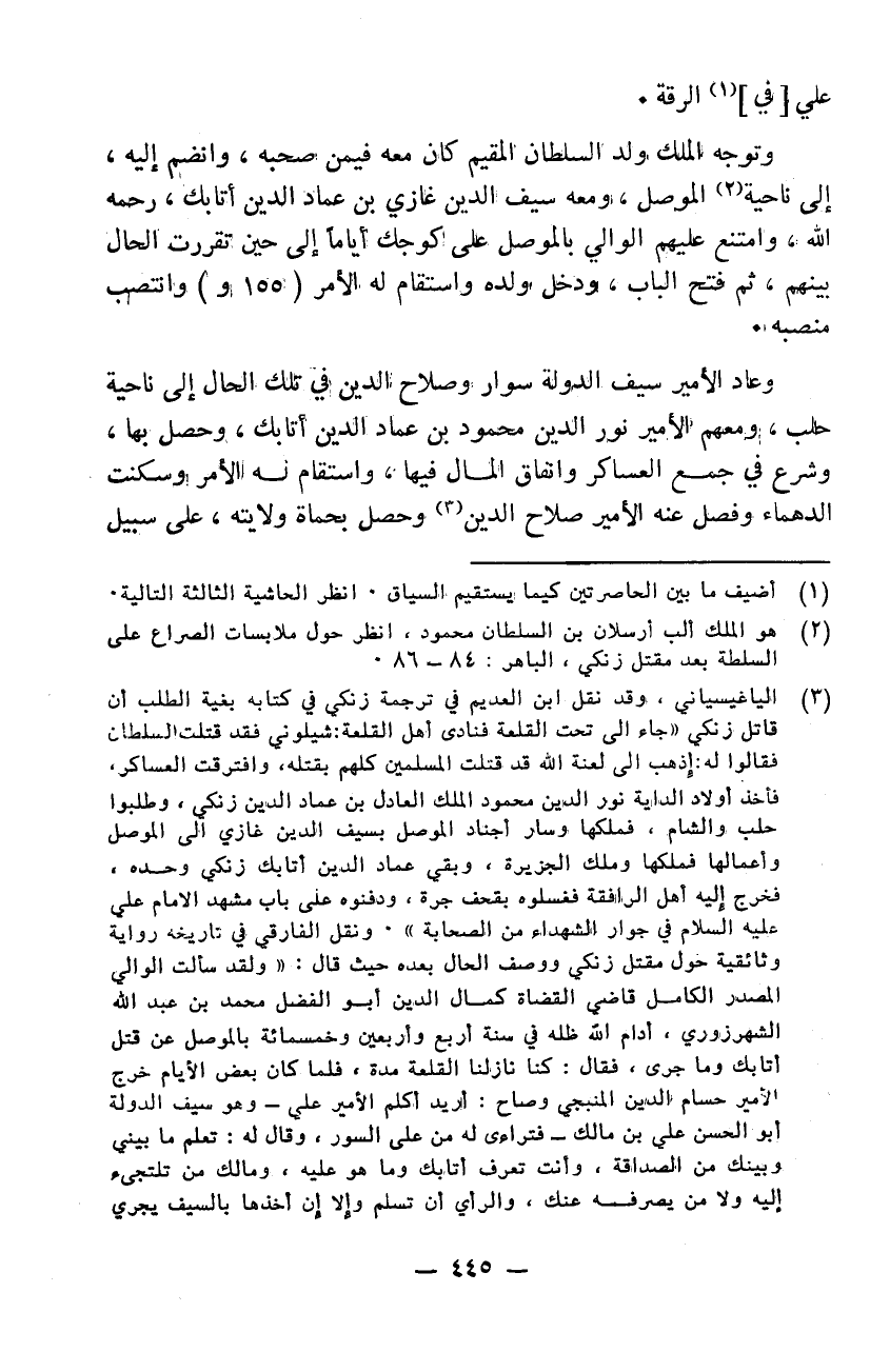 على الرقة وتوجه الملك ولد السلطان المقيم كان معه فيمن صحبه وانضم إليه إلى ناحية الموصل ومعه سيف الدين غازي بن عماد الدين أتابك رحمه الله وامتنع عليهم للوالي بالموصل على كوجك أياماً إلى حين تقررت الحال بينهم ثم فتح الباب ودخل ولده واستقام له الأمر وانتصب منصبه وعاد الأمير سيف الدولة سوار وصلاح الدين في تلك الحال إلى ناحية حلب ومعهم الأمير نور الدين محمود بن عماد الدين أتابك وحصل بها وشرع في جمع العساكر وانفاق المال فيها واستقام له الأمر وسكنت الدهماء وفصل عنه الأمير صلاح الدين وحصل بحماة ولايته على سبيل