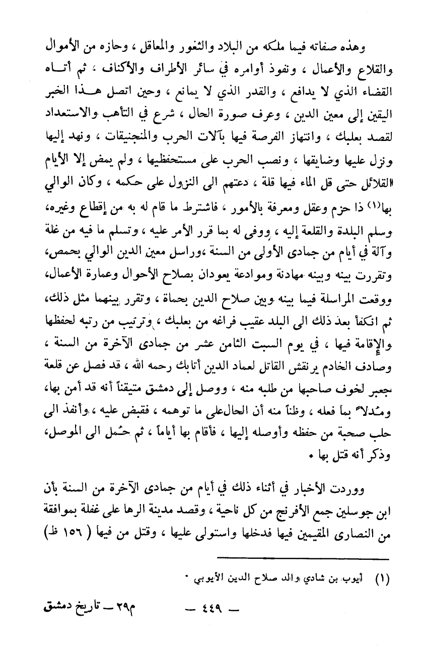 وهذه صفاته فيما ملكه من البلاد والثغور والمعاقل وحازه من الأموال والقلاع والأعمال ونفوذ أوامره في سائر الأطراف والأكناف ثم أتاه القضاء الذي لا يدافع والقدر الذي لا يمانع. وحين اتصل هذا الخبر اليقين إلى معين الدين وعرف صورة الحال شرع في التأهب والاستعداد لقصد بعلبك وانتهاز الفرصة فيها بآلات الحرب والمنجنيقات ونهد إليها ونزل عليها وضايقها ونصب الحرب على مستحفظيها ولم يمض إلا الأيام القلائل حتى قل الماء فيها قلةً دعتهم إلى النزول على حكمه. وكان الوالي بها ذا حزم وعقل ومعرفة بالأمور فاشترط ما قام له به من إقطاع وغيره وسلم البلدة والقلعة إليه ووفى له بما قرر الأمر عليه وتسلم ما فيه من غلة وآلة في أيام من جمادى الأولى من السنة. وراسل معين الدين الوالي بحمص وتقررت بينه وبينه مهادنة وموادعة يعودان بصلاح الأحوال وعمارة الأعمال. ووقعت المراسلة فيما بينه وبين صلاح الدين بحماة وتقرر بينهما مثل ذلك. ثم انكفأ بعد ذلك إلى البلد عقيب فراغه من بعلبك وترتيب من رتبه لحفظها والاقامة فيها في يوم السبت الثامن عشر من جمادى الآخرة من السنة وصادم الخادم يرنقش القاتل لعماد الدين أتابك رحمه الله قد فصل عن قلعة جعبر لخوف صاحبها من طلبه منه ووصل إلى دمشق متيقناً أنه قد أمن بها ومدلاً بما فعله وظناً منه أن الحال على ما توهمه فقبض عليه وأنفذ إلى حلب صحبة من حفظه وأوصله إليها فأقام بها أياماً ثم حمل إلى الموصل وذكر أنه قتل بهاووردت الأخبار في أثناء ذلك في أيام من جمادى الآخرة من السنة بأن ابن جوسلين جمع الافرنج من كل ناحية وقصد مدينة الرها على غفلة بموافقة من النصارى المقيمين فيها فدخلها واستولى عليها وقتل من فيها