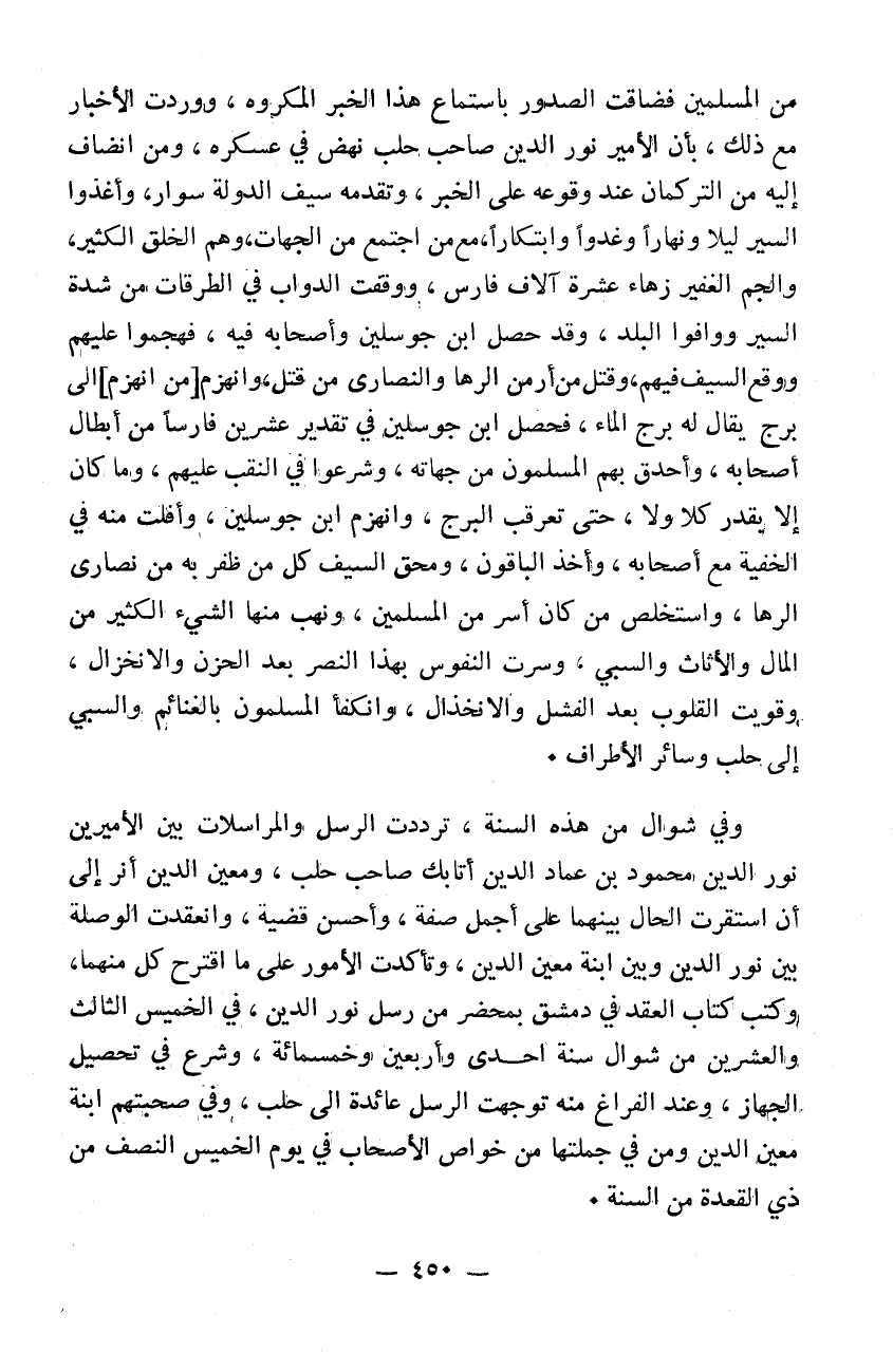 من المسلمين فضاقت الصدور باستماع هذا الخبر المكروه ووردت الأخبار مع ذلك بأن الأمير نور الدين صاحب حلب نهض في عسكره وانضاف إليه من التركمان عند وقوعه على الخبر وتقدمه سيف الدولة سوار وأغذوا السير ليلاً ونهاراً وغدواً وابتكاراً من اجتمع من الجهات وهم الخلق الكثير والجم الغفير زهاء عشرة ألف فارس ووقفت الدواب في الطرقات من شدة السير ووافوا البلد. وقد حصل ابن جوسلين وأصحابه فيه فهجموا عليهم ووقع السيف فيهم وقتل من أرمن الرها والنصارى من قتل وانهزم إلى برج يقال له برج الماء فحصل فيه ابن جوسلين في تقدير عشرين فارساً من إبطال أصحابه وأحدق بهم المسلمون من جهاته وشرعوا في النقب عليهم وما كان إلا بقدر كلا ولا حتى تعرقب البرج وانهزم ابن جوسلين وأفلت منه في الخفية مع أصحابه وأخذ الباقون ومحق السيف كل من ظفر به من نصارى الرها واستخلص من كان أسر من المسلمين ونهب منها الشيء الكثير من المال والأثاث والسبي وسرت النفوس بهذا النصر بعد الحزن والاختزال وقويت القلوب بعد الفشل والانخذال وانكفأ المسلمون بالغنائم والسبي إلى حلب وسائر الأطرافوفي شوال من هذه السنة ترددت الرسل والمراسلات من الأميرين نور الدين محمود بن عماد الدين أتابك صاحب حلب ومعين الدين أنر إلى أن استقرت الحال بينهما على أجمل صفة وأحسن قضية وانعقدت الوصلة بين نور الدين وبين ابنة معين الدين وتأكدت الأمور على ما اقترح كل منهما وكتب كتاب العقد في دمشق بمحضر من رسل نور الدين في الخميس الثالث والعشرين من شوال سنة 541 وشرع في تحصيل الجهاز وعند الفراغ منه توجهت الرسل عائدةً إلى حلب وفي صحبتهم ابنة معين الدين ومر في جملتها من خواص الأصحاب في يوم الخميس النصف من ذي القعدة من السنة