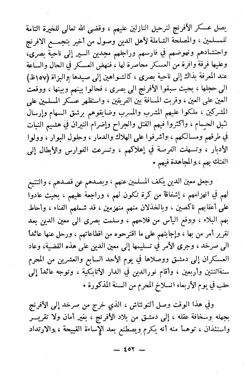 يصل عسكر الافرنج لترحيل النازلين عليهم وقضى الله تعالى للخيرة التامة للمسلمين والمصلحة الشاملة لأهل الدين وصول من أخب بتجمع الافرنج واحتشادهم ونهوضهم في فارسهم وراجلهم مجدين السير إلى ناحية بصرى وعليها فرقة وافرة من العسكر محاصرةً لها فنهض العسكر في الحال والساعة عند المعرفة بذاك إلى ناحية بصرى كالشواهين إلى صيدها والبزاة إلى حجلها بحيث سبقوا الافرنج إلى بصرى فحالوا بينهم وبينها ووقعت العين على العين وقربت المسافة بين الفريقين واستظهر عسكر المسلمين على المشركين وملكوا عليهم المشرب والمسرب وضايقوهم برشق السهام وارسال نبل الحمام وأكثروا فيهم القتل والجراح واضرام النيران في هشيم النبات في طرقهم ومسالكهم وأشرفوا على الهلاك والدمار وحلول البوار وولوا الأدبار وتسهلت الفرصة في إهلاكهم وتسرعت الفوارس والأبطال إلى الفتك بهم والمجاهدة فيهموجعل معين الدين يكف المسلمين عنهم ويصدهم عن قصدهم والتتبع لهم في انهزامهم اشفاقاً من كرةً تكون لهم وراجعة عليهم بحيث عادوا على أعقابهم ناكصين وبالخذلان منهم منهزمين قد شملهم الفناء وأحاط بهم البلاء ووقع اليأس من فلاحهم وسلمت بصرى إلى معين الدين بعد تقرير أمر من بها واجابهم على اقترحوه من اقطاعاتهم ورحل عنها عائداً إلى صرخد. وجرى الأمر في تسليمها إلى معين الدين على هذه القضية وعاد العسكران إلى دمشق ووصلاها في يوم الأحد السابع والعشرين من المحرم سنة 42 وأقام نور الدين في الدار الأتابكية وتوجه عائداً إلى حلب في يوم الأربعاء انسلاخ المحرم من السنة المذكورةوفي هذا الوقت وصل التونتاش الذي خرج من صرخد إلى الافرنج بجهله وسخافة عقله إلى دمشق من بلاد الافرنج بغير أمان ولا تقرير استئذان توهماً منه أنه يكرم ويصطنع بعد الاساءة القبيحة والارتداد