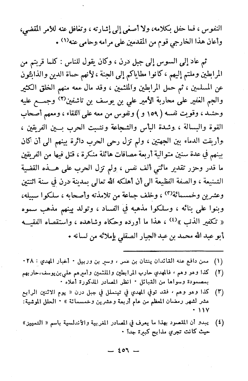 النفوس. فما حفل بكلامه ولا أصغى إلى إشارته وتغافل عنه للأمر المقضي وأعان هذا الخارجي قوم من المقدمين على مرامه وحامى عنهثم عاد إلى السوس إلى جبل درن وكان يقول للناس: كلما قربتم من المرابطين وملتم إليهم كانوا مطاياكم إلى الجنة لأنهم حماة الدين والذابون عن المسلمين. ثم حمل المرابطين والملثمين وقد مال معه منهم الخلق الكثير والجم الغفير على محاربة الأمير علي بن يوسف ابن تاشفين وجمع عليه وحشد وقويت نفسه ونفوس من معه على اللقاء ومعهم أصحاب القوة والبسالة وشدة البأس والشجاعة ونشبت الحرب بين الفريقين وأريقت الدماء بين الجهتين ولم تزل رحى الحرب دائرة بينهم إلى أن كان بينهم في عدة سنين متوالية أربعة مصافات هائلةً منكرة قتل فيها من الفريقين ما قدر وحزر تقدير مائتي ألف نفس ولم تزل الحرب على ذلك مستمرة على هذه القضية الشنيعة والصفة الفظيعة إلى أن أهلكه الله تعالى بمدينة درن في سنة 522. وخلف جماعةً من تلامذته وأصحابه سلكوا سبيله وبنوا على بنائه وسلكوا مذهبه في الفساد وتولد بينهم مذهب سموه تكفير الذنب هذا ما أورده وحكاه وشاهده واستقصاه الفقيه أبو عبد الله محمد ابن عبد الجبار الصقلي باملائه من لسانه