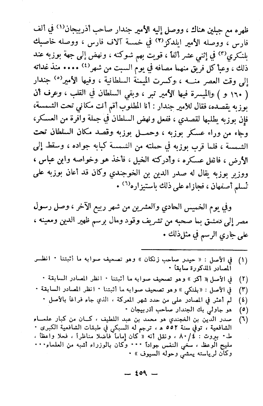 ظهره مع جبلين هناك ووصل إليه الأمير حيدر صاحب زنكان في ألف فارس ووصله الأمير اكز في خمسة ألف فارس ووصله خاصبك بلنكى في اثني عشر ألفاً قويت بهم شوكته ونهض إلى جهة بوزبه عند ذلك وعبأ كل فريق منهما مصافه في يوم السبت من شهر..... منذ غداته إلى وقت العصر منه وكسرت الميمنة السلطانية وفيها الأمير جندار والميسرة فيها الأمير تبر وبقي السلطان في القلب وعرف إن بوزبه يقصده فقال للأمير جندار: أنا المطلوب أقم أنت مكاني تحت الشمسة فإن بوزبه يطلبها لقصدي. ففعل ونهض السلطان في جملة وافرة من العسكر وجاء من وراء عسكر بوزبه وحمل بوزبه وقصد مكان السلطان تحت الشمسة فلما قرب بوزبه في جملته من الشمسة كبا به جواده وسقط إلى الأرض فانفل عسكره وأدركته الخيل فأخذ هو وخواصه وابن عباس ووزير بوزبه يقال له صدر الدين ابن الخوجندي وكان قد أعلن بوزبه على تسلم أصفهان فجازاه على ذلك باستيزاره وفي يوم الخميس الحادي والعشرين من شهر ربيع الآخر وصل رسول مصر إلى دمشق بما صحبه من تشريف وقود ومال برسم ظهير الدين ومعينه على جاري الرسم في مثل ذلك.