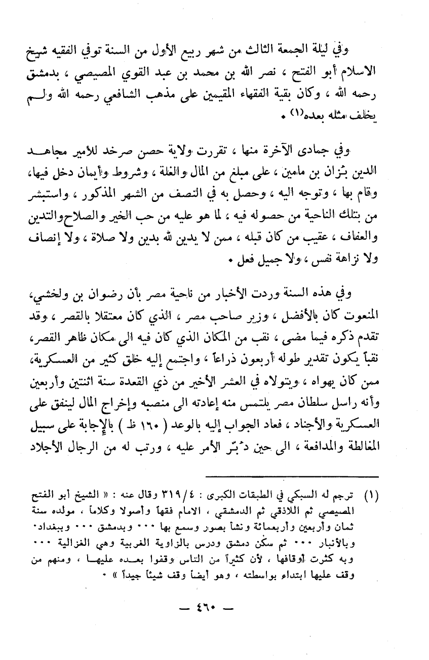 وفي ليلة الجمعة الثالث من شهر ربيع الأول من السنة توفي الفقيه شيخ الاسلام أبو الفتح نصر الله بن محمد بن عبد القوي المصيصي بدمشق رحمه الله وكان بقية الفقهاء المقيمين على مذهب الشافعي رحمه الله ولم يخلف مثله بعده