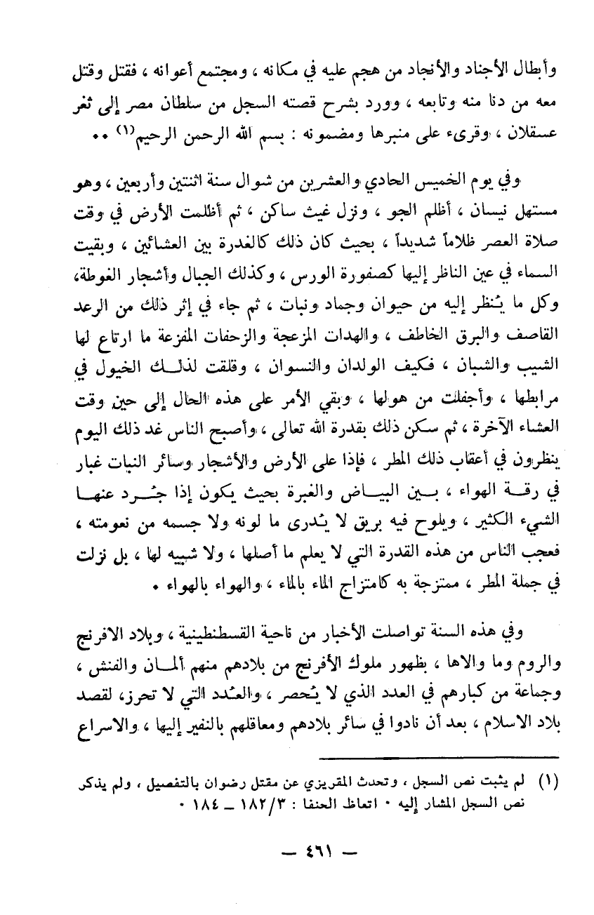 وأبطال الأجناد والأنجاد من هجم عليه في مكانه ومجتمع أعوانه فقتل وقتل معه من دنا منه وتابعه وورد بشرح قصته السجل من سلطان مصر إلى ثغر عسقلان وقرئ على منبرها ومضمونه: بسم الله الرحمن الرحيم..... وفي يوم الخميس الحادي والعشرين من شوال سنة 42 وهو مستهل نيسان أظلم الجو ونزل غيث ساكن ثم أظلمت الأرض في وقت صلاة العصر ظلاماً شديداً بحيث كان ذلك كالغدرة بين العشايين وبقيت السماء في عين الناظر إليها كصفورة الورس وكذلك الجبال وأشجار الغوطة وكل ما ينظر إليه من حيوان وجماد ونبات. ثم جاء في أثر ذلك من الرعد القاصف والبرق الخاطف والهدات المزعجة والزحفات المفزعة ما ارتاع لها الشيب والشبان فكيف الولدان والنسوان وقلقت لذلك الخيول في مرابطها وأجفلت من هولها وبقي الأمر على هذه الحال إلى حين وقت العشاء الآخرة ثم سكن ذلك بقدرة الله تعالى وأصبح الناس غد ذلك اليوم ينظرون في أعقاب ذلك المطر فإذا على الأرض والأشجار وسائر النبات غبار في رقة الهواء بين البياض والغبرة بحيث يكون إذا جرد عنها الشيء الكثير ويلوح فيه بريق لا يدرى ما لونه ولا جسمه من نعومته فعجب الناس من هذه القدرة التي لا يعلم ما أصلها ولا شبيه لها بل نزلت في جملة المطر ممتزجةً به كامتزاج الماء بالماء والهواء بالهواء وفي هذه السنة تواصلت الأخبار من ناحية القسطنطينية وبلاد الافرنج والروم وما والاها بظهور ملك الافرنج من بلادهم منهم المان والفنش وجماعة من كبارهم في العدد الذي لا يحصر والعدد التي لا تحزر لقصد بلاد الاسلام بعد أن نادوا في سائر بلادهم ومعقلهم بالنفير إليها والاسراع