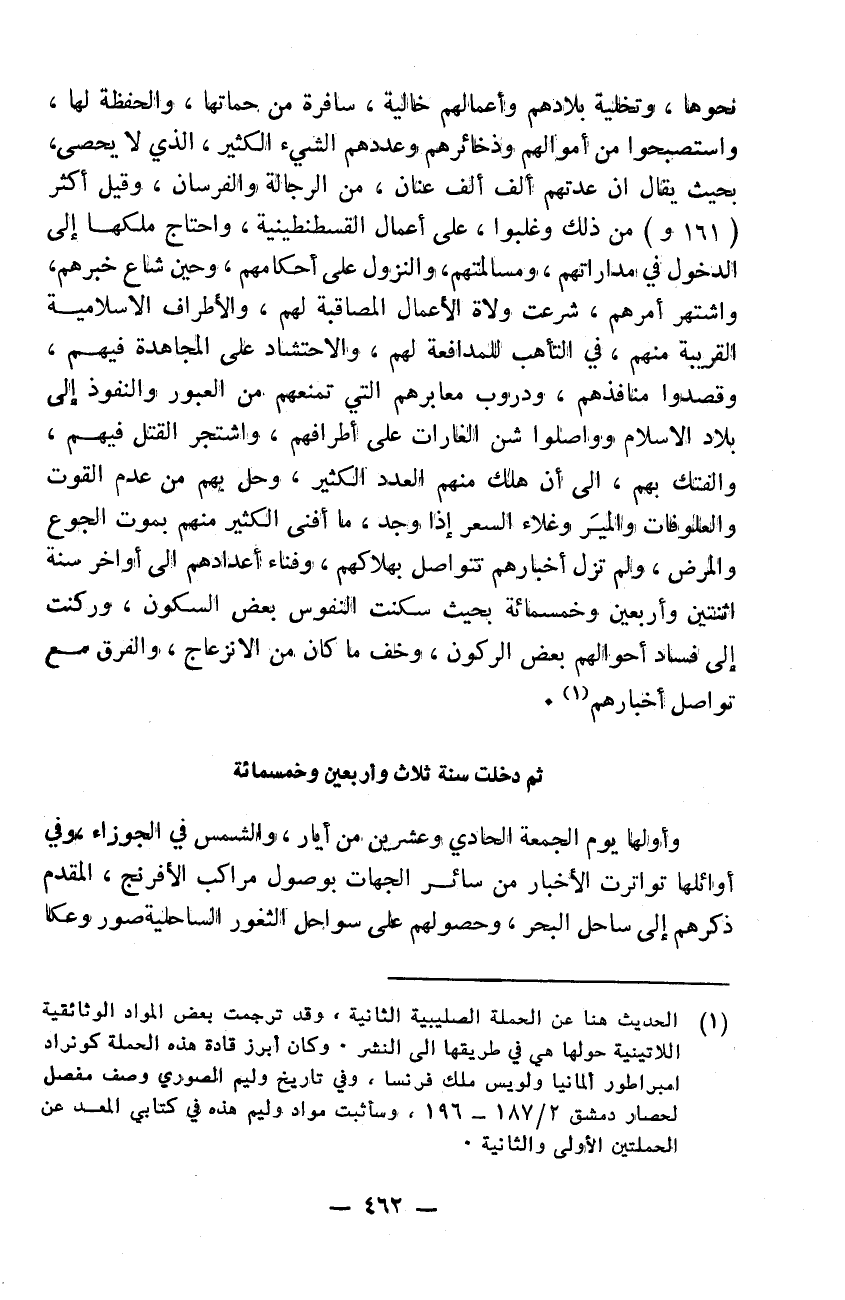 نحوها وتخلية بلادهم وأعمالهم خاليةً سافرةً من حماتها والحفظة لها واستصحبوا من أموالهم وذخائرهم وعددهم الشيء الكثير الذي لا يحصى بحيث يقال إن عدتهم ألف ألف عنان من الرجالة والفرسان وقيل أكثر من ذلك وغلبوا على أعمال القسطنطينية واحتاج ملكها إلى الدخول في مداراتهم ومسالمتهم والنزول على أحكامهم. وحين شاع خبرهم واشتهر أمرهم شرعت ولاة الأعمال المصاقبة لهم والأطراف الاسلامية القريبة منهم في التأهب للمدافعة لهم والاحتشاد على المجاهدة فيهم وقصدوا منافذهم ودروب معابرهم التي تمنعهم من العبور والنفوذ إلى بلاد الاسلام وواصلوا شن الغارات على أطرافهم واشتجر القتل فيهم والفتك بهم إلى أن هلك منهم العدد الكثير وحل بهم من عدم القوت والعلوفات والمير وغلاء السعر إذا وجد ما أفنى الكثير منهم بموت الجوع والمرض ولم تزل أخبارهم تتواصل بهلاكهم وفناء أعدادهم إلى أواخر سنة 542 بحيث سكنت النفوس بعض السكون وركنت إلى فساد أحوالهم بعض الركون وخف ما كان من الانزعاج والفرق مع تواصل أخبارهم