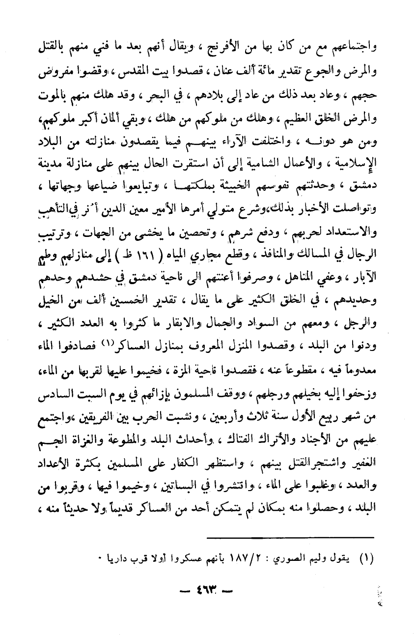 واجماعهم مع من كان بها من الافرنج ويقال إنهم بعد ما فني منهم بالقتل والمرض والجوع تقدير مائة ألف عنان وقصدوا بيت المقدس وقضوا مفروض حجهم وعاد بعد ذلك من عاد إلى بلادهم في البحر. وقد هلك منهم بالموت والمرض الخلق العظيم وهلك من ملوكهم من هلك وبقي المان أكبر ملوكهم ومن هو دونه واختلفت الآراء بينهم فيما يقصدون منازلته من البلاد الاسلامية والأعمال الشامية إلى أن استقرت الحال بينهم على منازلة مدينة دمشق وحدثتهم نفوسهم الخبيثة بملكتها وتبايعوا ضياعها وجهاتها. وتواصلت الأخبار بذلك وشرع متولي أمرها الأمير معين الدين أنر في التأهب والاستعداد لحربهم ورفع شرهم وتحصين ما يخشى من الجهات وترتيب الرجال في المسالك والمنافذ وقطع مجاري الميرة إلى منازلهم وطم الآبار وعفى المناهل وصرفوا أعنتهم إلى ناحية دمشق في حشدهم وحدهم وحديدهم في الخلق الكثير على ما يقال تقدير الخمسين ألف من الخيل والرجل ومعهم من السواد والجمال والأبقار ما كثروا به العدد الكثير ودنوا من البلد وقصدوا المنزل المعروف بمنازل العساكر فصادفوا الماء معدوماً فيه مقطوعاً عنه فقصدوا ناحية المزة فخيموا عليها لقربها من الماء وزحفوا إليه بخيلهم ورجلهم. ووقف المسلمون بإزائهم في يوم السبت السادس من شهر ربيع الأول سنة 43 ونشبت الحرب بين الفريقين واجتمع عليهم من الأجناد والأتراك القتال وأحداث البلد والمطوعة والغزاة الجم الغفير واشتجر القتل بينهم واستظهر الكفار على المسلمين بكثرة الأعداد والعدد وغلبوا على الماء وانتشروا في البساتين وخيموا فيها وقربوا من البلد وحصلوا منه بمكان لم يتمكن أحد من العساكر قديماً ولا حديثاً منه.