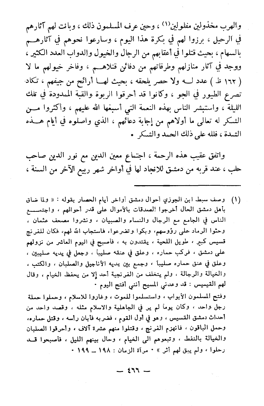 والهرب مخذولين مفلولين. وحين عرف المسلمون ذلك وبانت لهم آثارهم في الرحيل برزوا لهم في بكرة هذا اليوم وسارعوا نحوهم في آثارهم بالسهام بحيث قتلوا في أعقابهم من الرجال والخيول والدواب العدد الكثير ووجد في آثار منازلهم وطرقاتهم من دفائن قتلاهم وفاخر خيولهم ما لا عدد له ولا حصر يلحقه بحيث لها أرائح من جيفهم تكاد تصرع الطيور في الجو وكانوا قد أحرقوا الربوة والقبة الممدودة في تلك الليلة واستبشر الناس بهذه النعمة التي أسبغها الله عليهم وأكثروا من الشكر له تعالى ما أولاهم من إجابة دعائهم الذي واصلوه في أيام هذه الشدة فلله على ذلك الحمد والشكر واتفق عقيب هذه الرحمة اجتماع معين الدين مع نور الدين صاحب حلب عند قربه من دمشق للانجاد لها في أواخر شهر ربيع الآخر من السنة