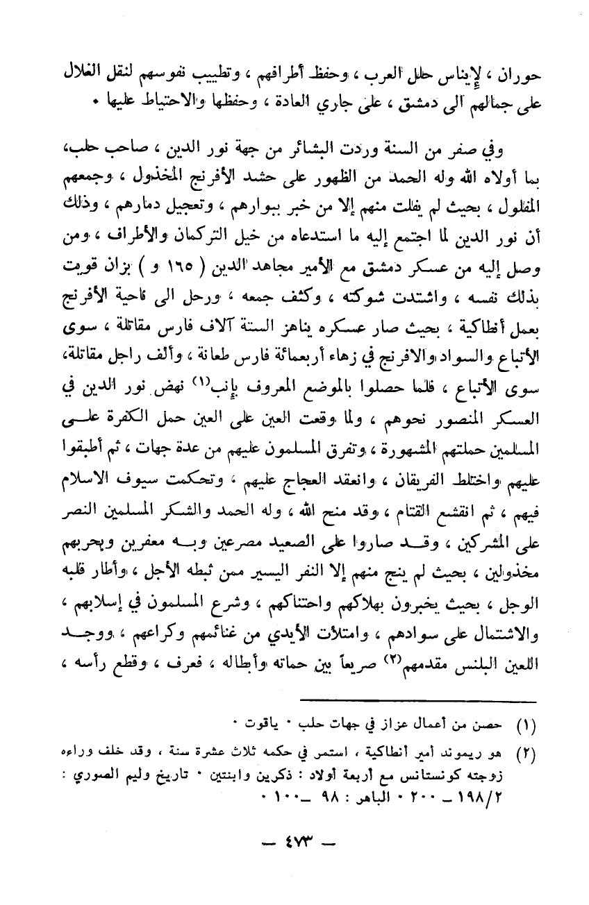 وفي صفر من السنة وردت البشائر من جهة نور الدين صاحب حلب بما أولاه الله وله الحمد من الظهور على حشد الافرنج المخذول وجمعهم المفلول بحيث لم يفلت منهم إلا من خبر ببوارهم وتعجيل دمارهم وذلك أن نور الدين لما اجتمع إليه ما استدعاه من خيل التركمان والأطراف ومن وصل إليه من عسكر دمشق مع الأمير مجاهد الدين بزان قويت بذاك نفسه واشتدت شوكته وكثف جمعه ورحل إلى ناحية الافرنج بعمل أنطاكية بحيث صار عسكره يناهز الستة آلاف فارس مقاتلة سوى الاتباع والسواد والافرنج في زهاء أربعمائة فارس طعانة وألف راجل مقاتلة سوى الاتباع. فلما حصلوا بالموضع المعروف بإنب نهض نور الدين في العسكر المنصور نحوهم ولما وقعت العين حمل الكفرة على المسلمين حملتهم المشهورة وتفرق المسلمون عليهم من عدة جهات ثم أطبقوا عليهم واختلط الفريقان وانعقد العجاج عليهم وتحكمت سيوف الاسلام فيهم ثم انقشع القتام وقد منح الله وله الحمد والشكر المسلمين النصر على المشركين وقد صاروا على الصعيد مصرعين وبه مغفرين وبحربهم مخذولين بحيث لم ينج منهم إلا النفر اليسير ممن ثبطه الأجل وأطار قلبه الوجل بحيث يخبرون بهلاكهم واحتناكهم وشرع المسلمون في اسلابهم والاشتمال على سوادهم وامتلأت الأيدي من غنائمهم وكراعهم. ووجد اللعين البلنس مقدمهم صريعاً بين حماته وابطاله فعرف وقطع رأسه