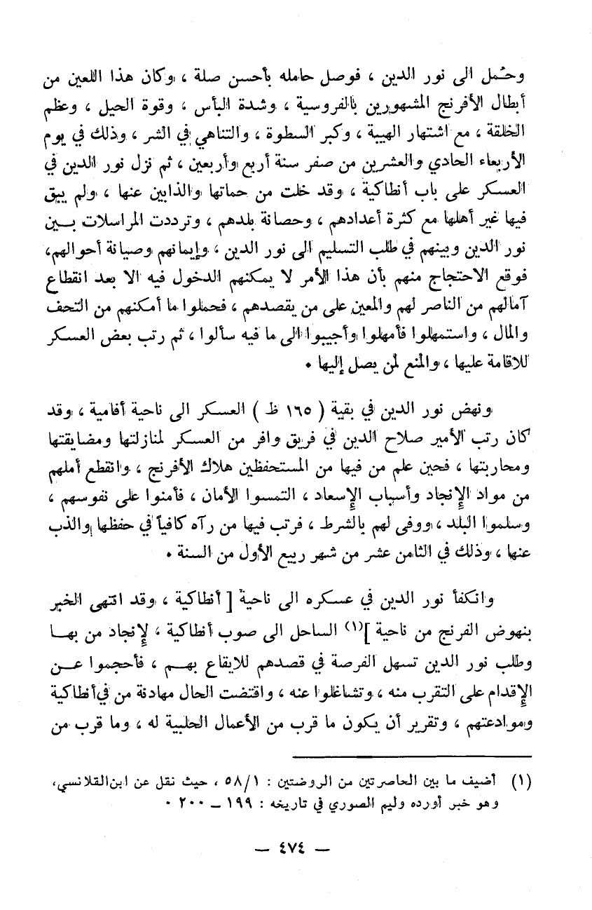 وحمل إلى نور الدين فوصل حامله بأحسن صلة وكان هذا اللعين من إبطال الافرنج المشهورين بالفروسية وشدة البأس وقوة الحيل وعظم الخلقة مع اشتهار الهيبة وكبر السطوة والتناهي في الشر وذلك في يوم الأربعاء الحادي والعشرين من صفر سنة 44 ثم نزل نور الدين في العسكر على باب أنطاكية وقد خلت من حماتها والذابين عنها ولم يبق فيها غير أهلها مع كثرة أعدادهم وحصانة بلدهم وترددت المراسلات بين نور الدين وبينهم في طلب التسليم إلى نور الدين وإيمانهم وصيانة أحوالهم فوقع الاحتجاج منهم بأن هذا الأمر لا يمكنهم الدخول فيه إلا بعد انقطاع أمالهم من الناصر لهم والمعين على من يقصدهم فحملوا ما أمكنهم من التحف والمال واستمهلوا فأمهلوا وأجيبوا إلى ما فيه سألوا ثم رتب بعض العسكر للاقامة عليها والمنع لمن يصل إليها ونهض نور الدين في بقية العسكر إلى ناحية أفامية. وقد كان رتب الأمير صلاح الدين في فريق وافر من العسكر لمنازلتها ومضايقتها ومحاربتها فحين علم من فيها من المستحفظين هلاك الافرنج وانقطع أملهم من مواد الانجاد وأسباب الاسعاد التمسوا الأمان فأمنوا على نفوسهم وسلموا البلد ووفى لهم بالشرط فرتب فيها من رآه كافياً في حفظها والذب عنها وذلك في الثامن عشر من شهر ربيع الأول من السنة وانكفأ نور الدين في عسكره إلى ناحية الساحل إلى صوب أنطاكية لانجاد من بها وطلب نور الدين تسهل الفرصة في قصدهم للايقاع بهم فأحجموا عن الاقدام على التقرب منه وتشاغلوا عنه واقتضت الحال مهادنة من في أنطاكية وموادعتهم وتقرير أن يكون ما قرب من الأعمال الحلبية له ما قرب من