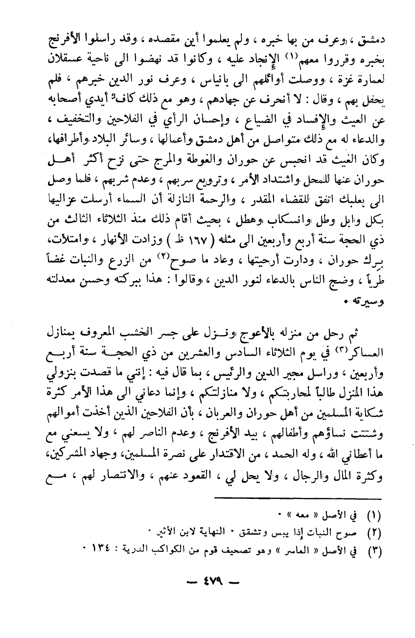 دمشق وعرف من بها خبره ولم يعلموا أين مقصده وقد كانوا أرسلوا الافرنج بخبره وقروا معهم الأنجاد عليه وكانوا قد نهضوا إلى ناحية عسقلان لعمارة غزة ووصلت أوائلهم إلى بانياس. وعرف نور الدين خبرهم فلم يحفل بهم وقال: لا أنحرف عن جهادهم. وهو مع ذلك كاف أيدي أصحابه عن العيث والافساد في الضياع وإحسان الرأي في الفلاحين والتخفيف والدعاء له مع ذلك متواصل من أهل دمشق وأعمالها وسائر البلاد وأطرافها. وكان الغيث قد انحبس عن حوران والغوطة والمرج حتى نزح أكثر أهل حوران عنها للمحل واشتداد الأمر وترويع سربهم وعدم شربهم. فلما وصل إلى بعلبك اتفق للقضاء المقدر والرحمة النازلة أن السماء أرسلت عزاليها بكل وابل وطل وانسكاب وهطل بحيث أقام ذلك منذ يوم الثلاثاء الثالث من ذي الحجة سنة 44 إلى مثله وزادت الأنهار وامتلأت برك حوران ودارت أرحيتها وعاد ما صرح من الزرع والنبات غصناً طريئاً وضج الناس بالدعاء لنور الدين وقالوا: هذا ببركته وحسن معدلته وسيرته ثم رحل من منزله بالأعوج ونزل على جسر الخشب المعروف بمنازل العاسر في يوم الثلاثاء السادس والعشرين من ذي الحجة سنة 44 وراسل مجير الدين والرئيس بما قال فيه: إنني ما قصدت بنزولي هذا المنزل طالباً لمحاربتكم ولا منازلتكم وإنما دعاني إلى هذا الأمر كثرة شكاية المسلمين من أهل حوران والعربان بأن الفلاحين الذين أخذت أموالهم وشتت نساؤهم وأطفالهم بيد الافرنج وعدم الناصر لهم لا يسعني مع ما أعطاني الله وله الحمد من الاقتدار على نصرة المسلمين وجهاد المشركين وكثرة المال والرجال ولا يحل لي القعود عنهم والانتصار لهم مع